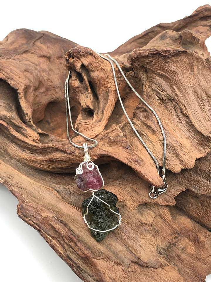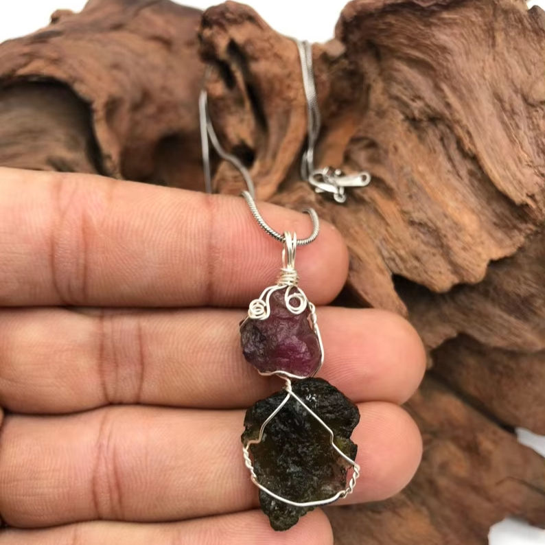 จี้พลอยดิบทำด้วยมือจากธรรมชาติพร้อมทัวร์มาลีนสีชมพูและพลอยสีเขียวแท้ที่ทรงพลังที่สุดปราศจากโซ่ขนาด18นิ้ว