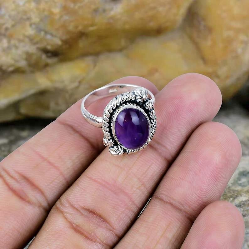 แหวนพลอยอเมทิสต์ทรงรีประดับขอบเงินแท้ 925 ทำด้วยมือจากหินธรรมชาติ เหมาะสำหรับเป็นของขวัญในวันเกิด งานแต่งงาน หรือโอกาสพิเศษ