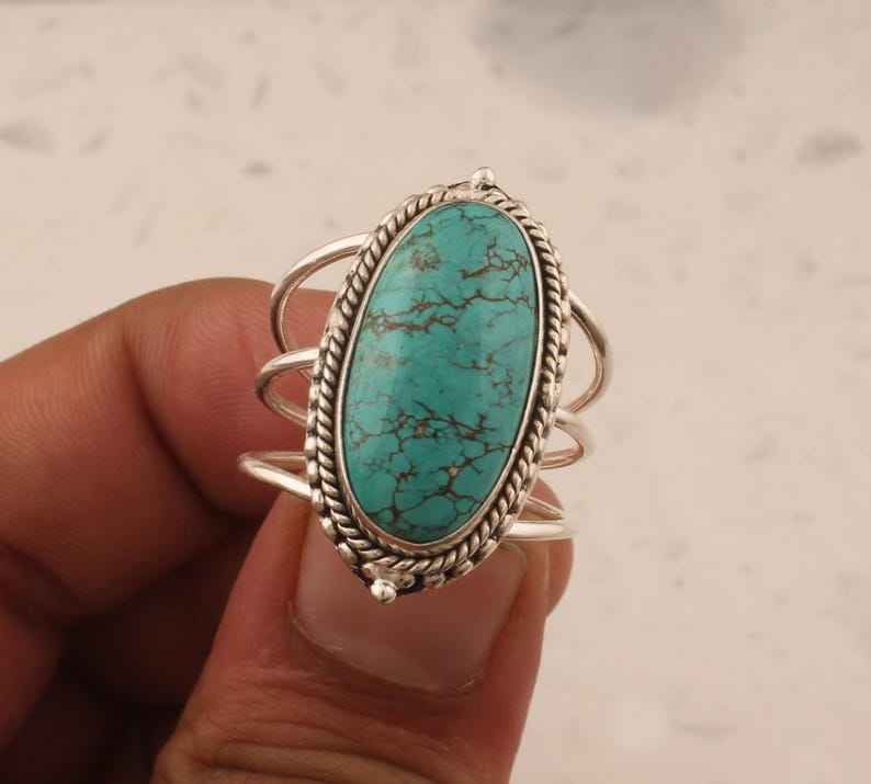 แหวนเงินแท้ประดับพลอยเทอร์ควอยซ์ธรรมชาติทรงรีแบบฝังขอบ งานแฮนด์เมด เหมาะสำหรับงานแต่งงานและงานปาร์ตี้