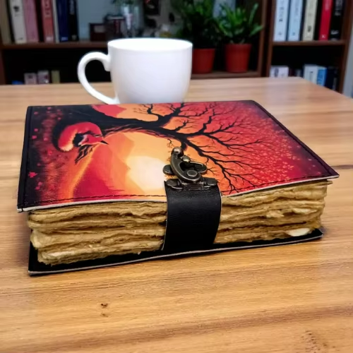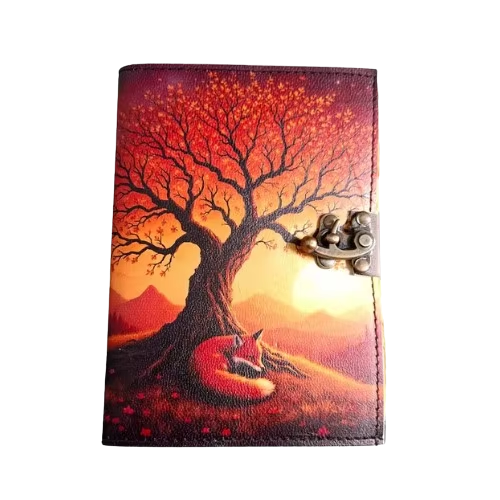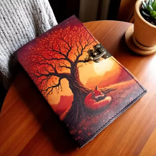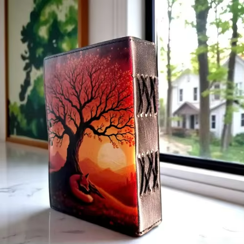 สมุดบันทึกธรรมชาติทำมือ-สมุดบันทึกหนังแท้ ลายฟ็อกซ์ซันเซ็ท ดีไซน์เรียบง่ายสไตล์ป่าไม้ สมุดบันทึกคลาสสิกสำหรับฤดูใบไม้ร่วง สมุดวาดภาพทำมือ