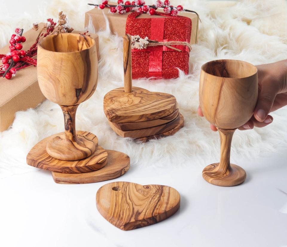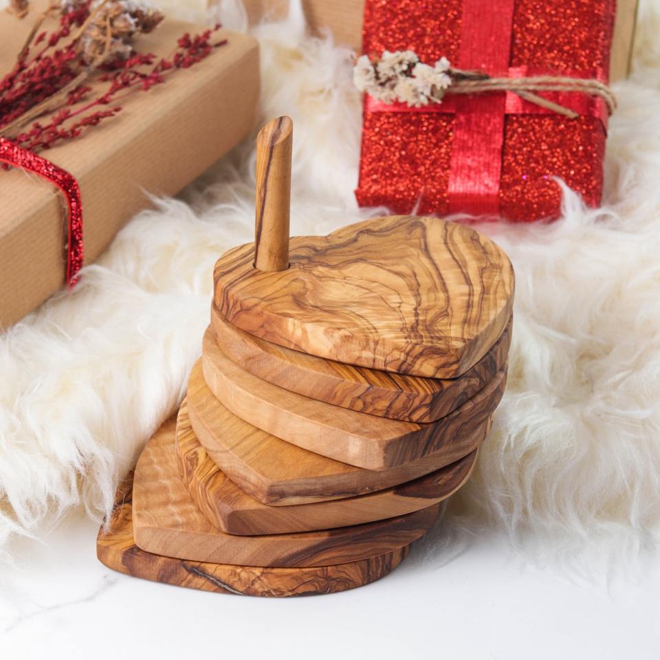 ชุดที่รองแก้วทำมือจากไม้มะกอก 6 ชิ้น รูปหัวใจ ศิลปะสมัยใหม่ ของตกแต่งโบราณ สำหรับจานและชาม งานแต่งงาน ผลิตในรัฐเทนเนสซี