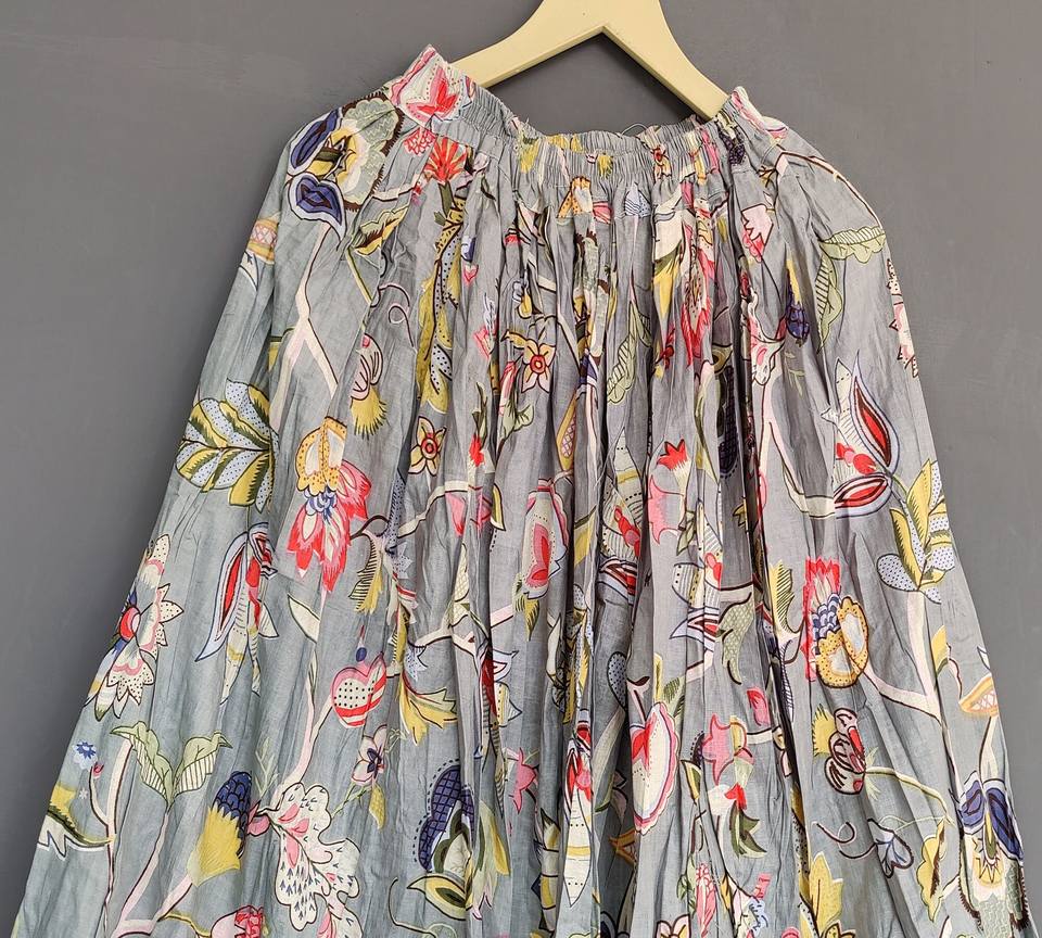 กระโปรงยาวทรงเข้ารูปสำหรับผู้หญิงไซส์พลัส ทำจากผ้าฝ้ายออร์แกนิกแฮนด์เมด ลายพิมพ์บล็อกดอกไม้จากเมืองชัยปุระ เอวธรรมชาติ ระบายอากาศได้ดี แบบพันรอบตัว