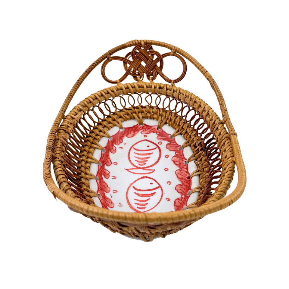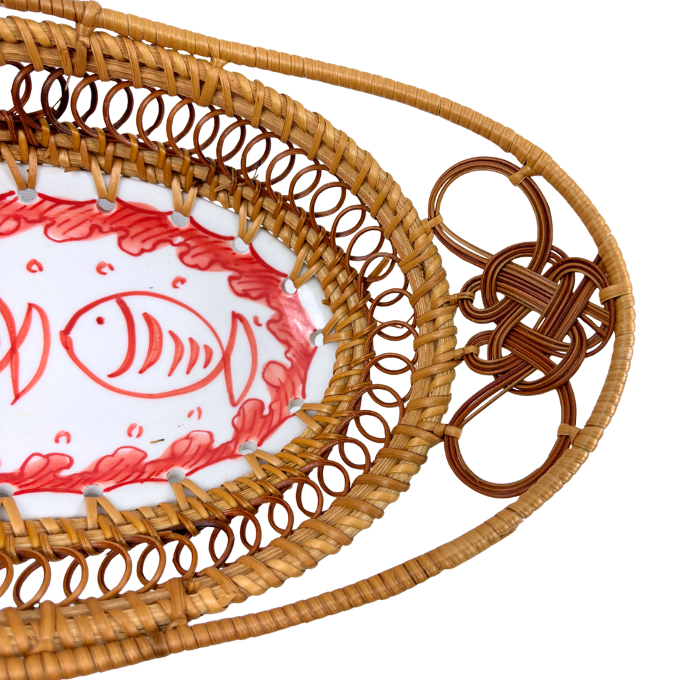 ถาดเสิร์ฟเซรามิกทรงรีทำด้วยมือพร้อมที่จับหวายสานลายปลาสีแดงสำหรับตกแต่งบ้านห้องครัวงานปาร์ตี้