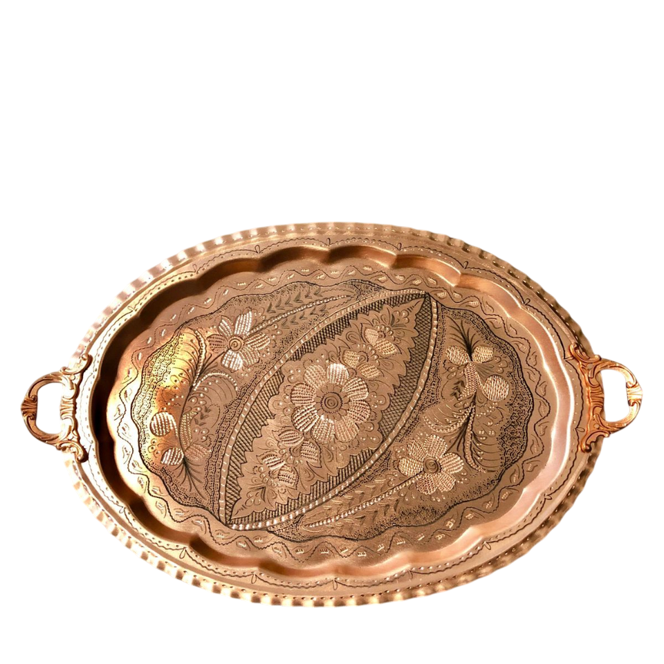 ถาดเสิร์ฟทองแดงรูปไข่ทำมือ พร้อมหูจับ ถาดโลหะสำหรับกาแฟ ชา อาหารเช้า ของตกแต่งบ้าน ถาดตกแต่งที่ไม่เหมือนใคร