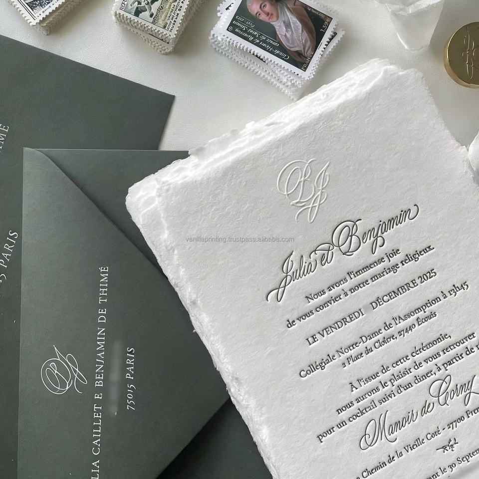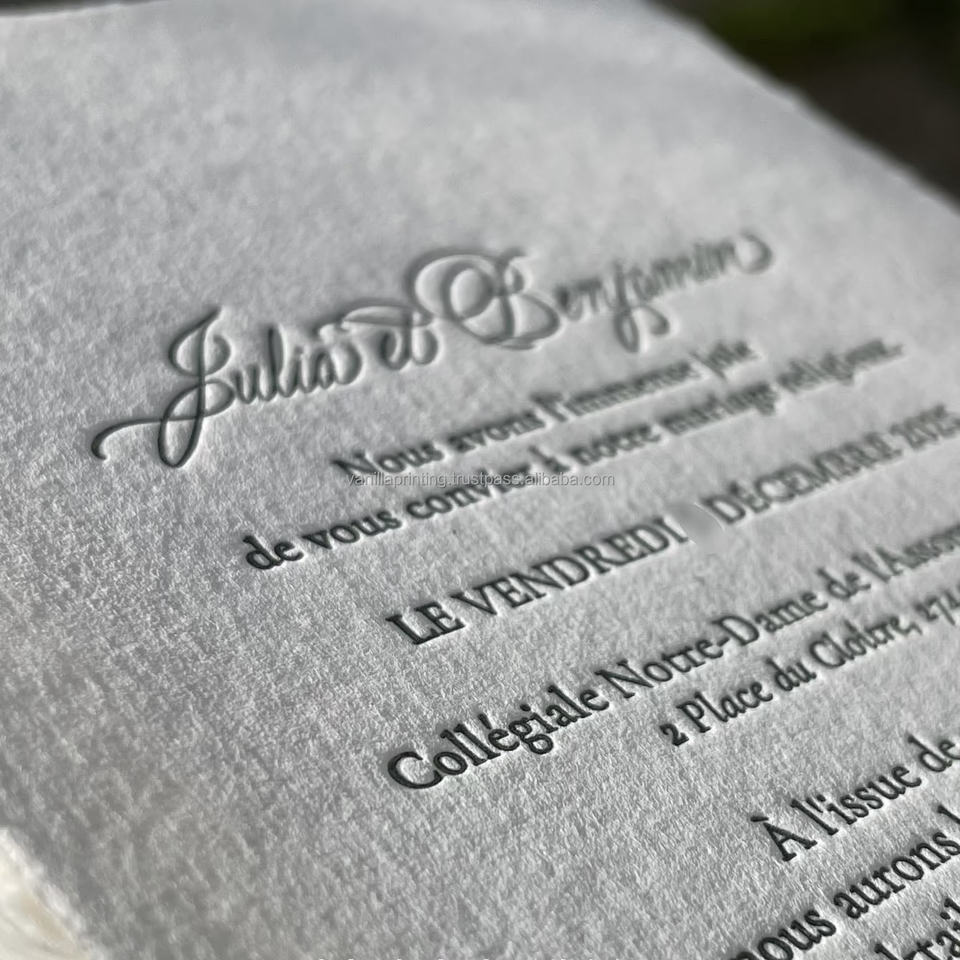 การ์ดเชิญงานแต่งงานแบบกำหนดเอง พิมพ์ด้วยเครื่องพิมพ์แบบ Letterpress ขอบกระดาษทำมือ ลายนูน ดีไซน์หรูหรา พร้อมโลโก้สั่งทำพิเศษ