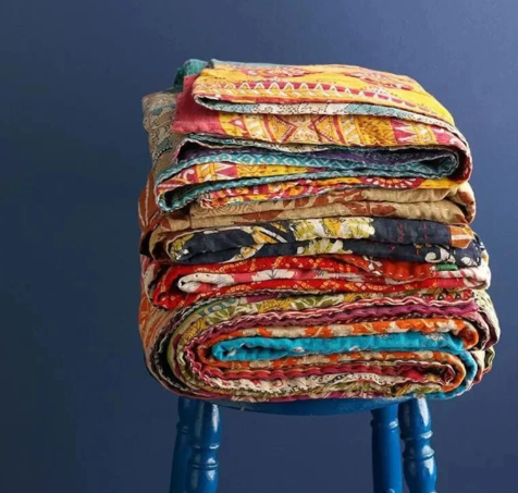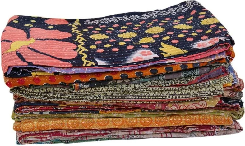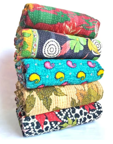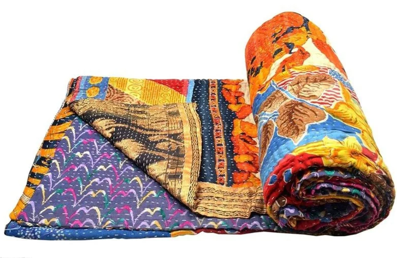 ผ้านวมลายปะติดทำด้วยมือผ้าคลุมเตียงขนาดควีนไซส์แบบกลับด้านได้ผ้าคลุมเตียงส่าหรีคอตตอนออร์แกนิค100% ตกแต่งเครื่องนอน