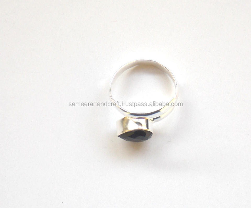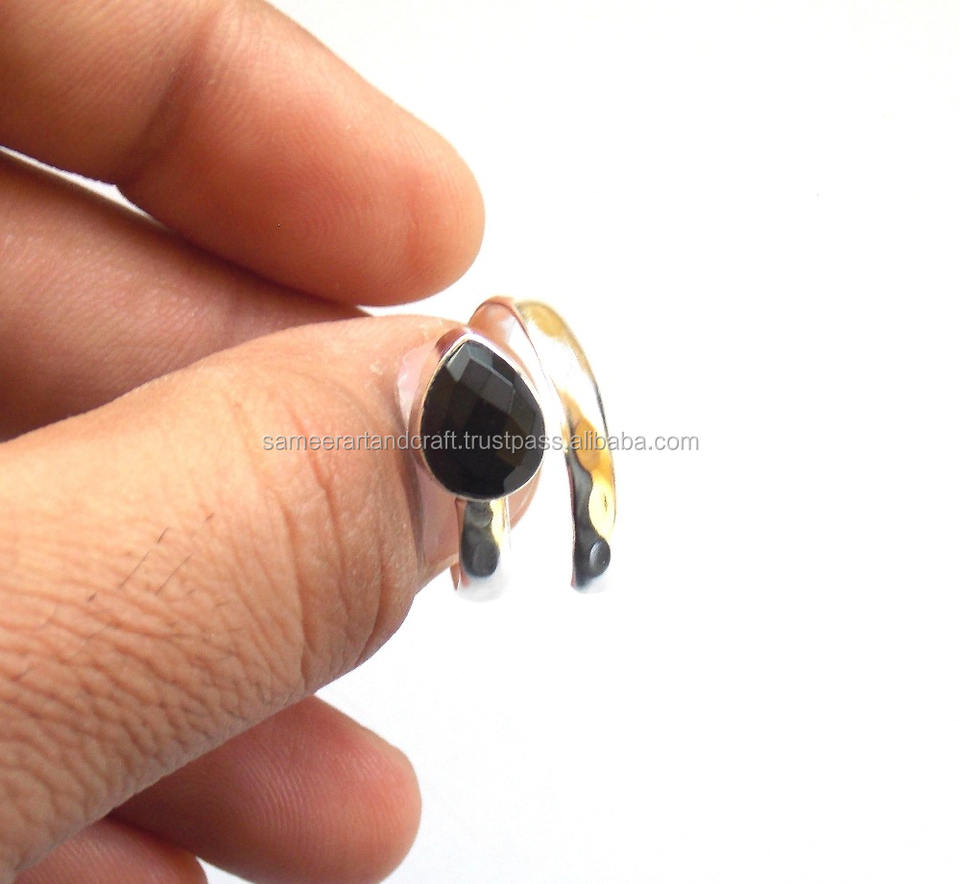 แหวนพลอยสีดำนิลชุบเงินปรับได้ทำด้วยมือ