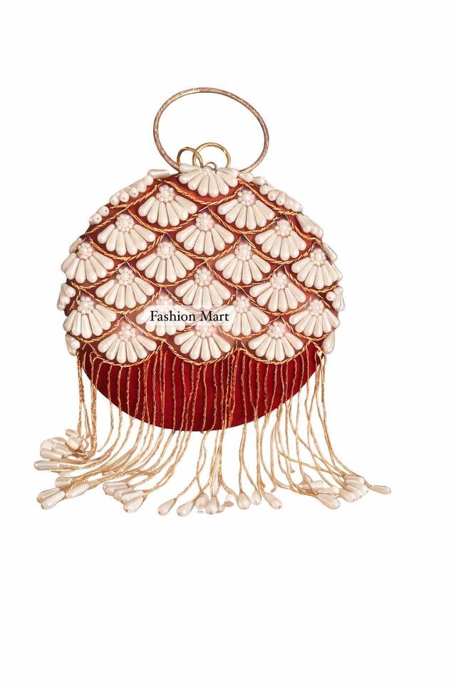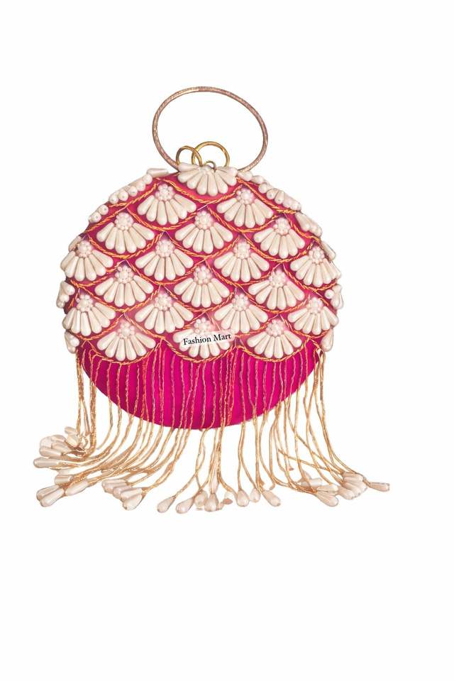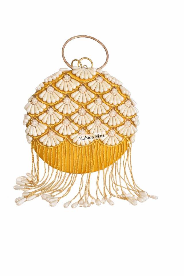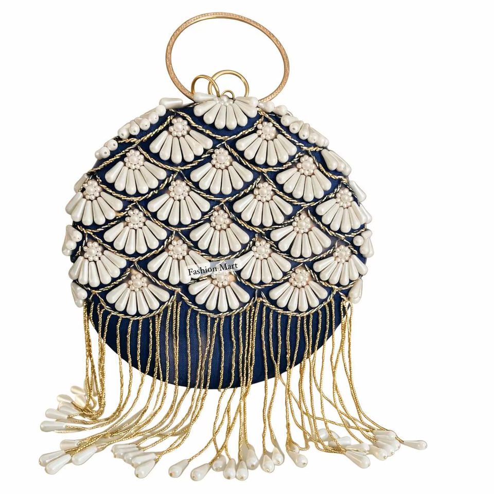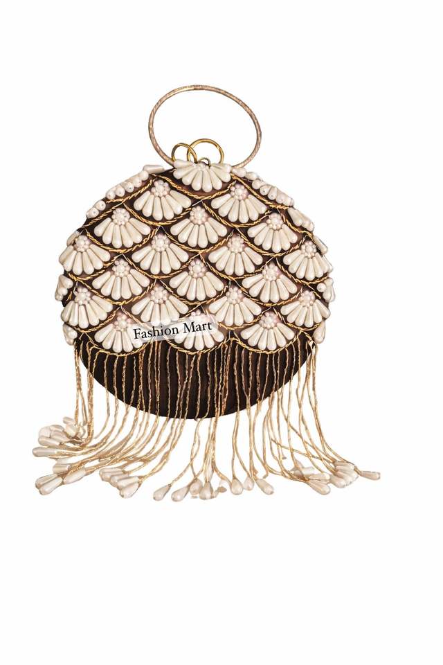 กระเป๋าคลัทช์ทรงกลมลายเปลือกหอยมุกทำมือ พร้อมพู่ห้อยโซ่ทองและหูจับโลหะ