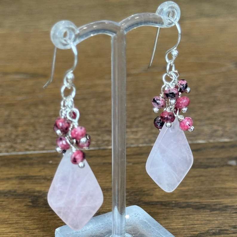 ต่างหูห้อยประดับพลอยสีชมพูทำมือ ควอตซ์สีชมพู หยกขาว สไตล์โบฮีเมียน ของขวัญสุดหรูสำหรับเธอ