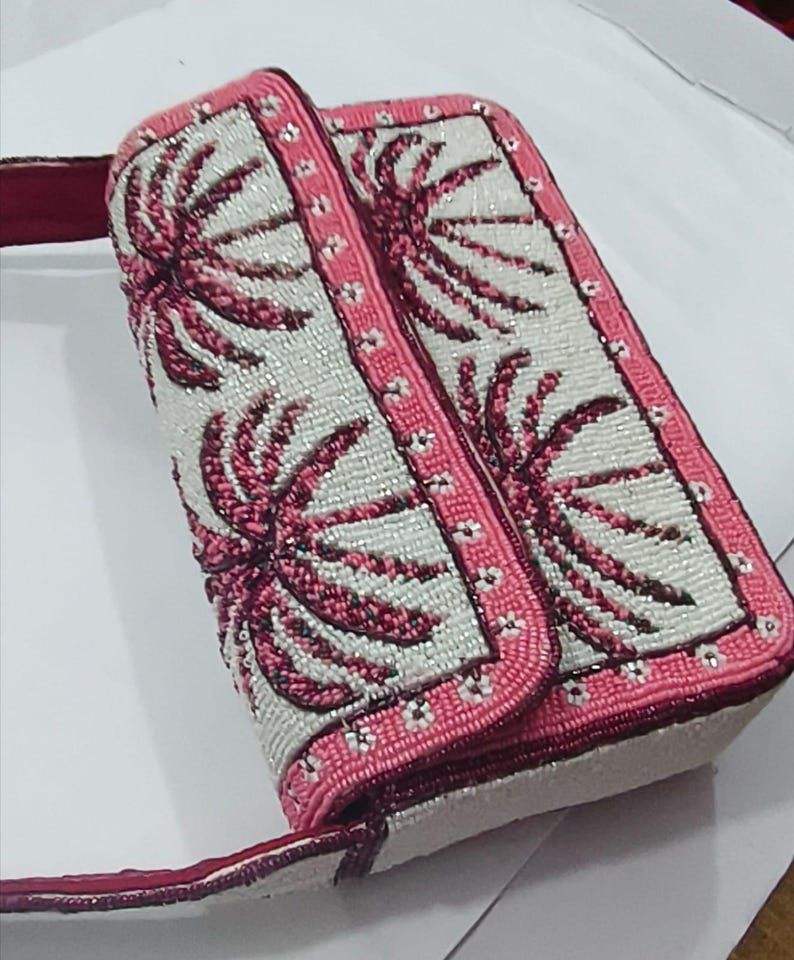กระเป๋าถือทำมือประดับลูกปัดลายต้นปาล์มสีชมพู ลายเกาะเขตร้อน งานลูกปัดแก้ว กระเป๋าสะพายไหล่แบบมีฝาปิด แฟชั่นสำหรับผู้หญิง ฤดูร้อน ชายหาด
