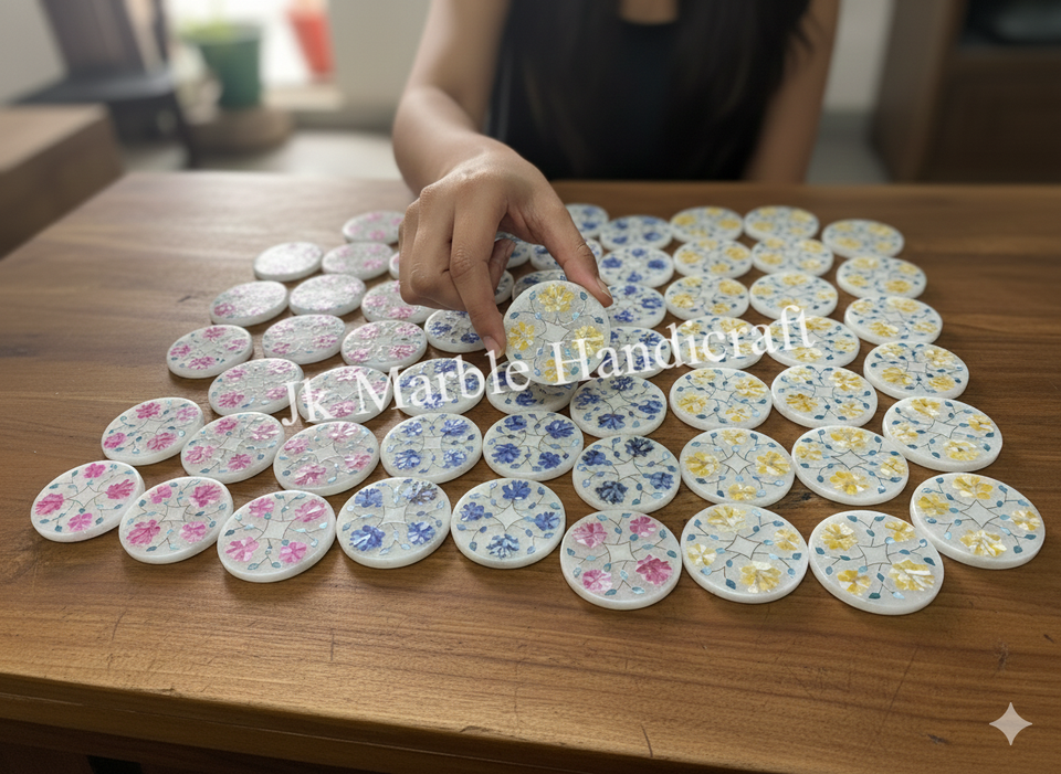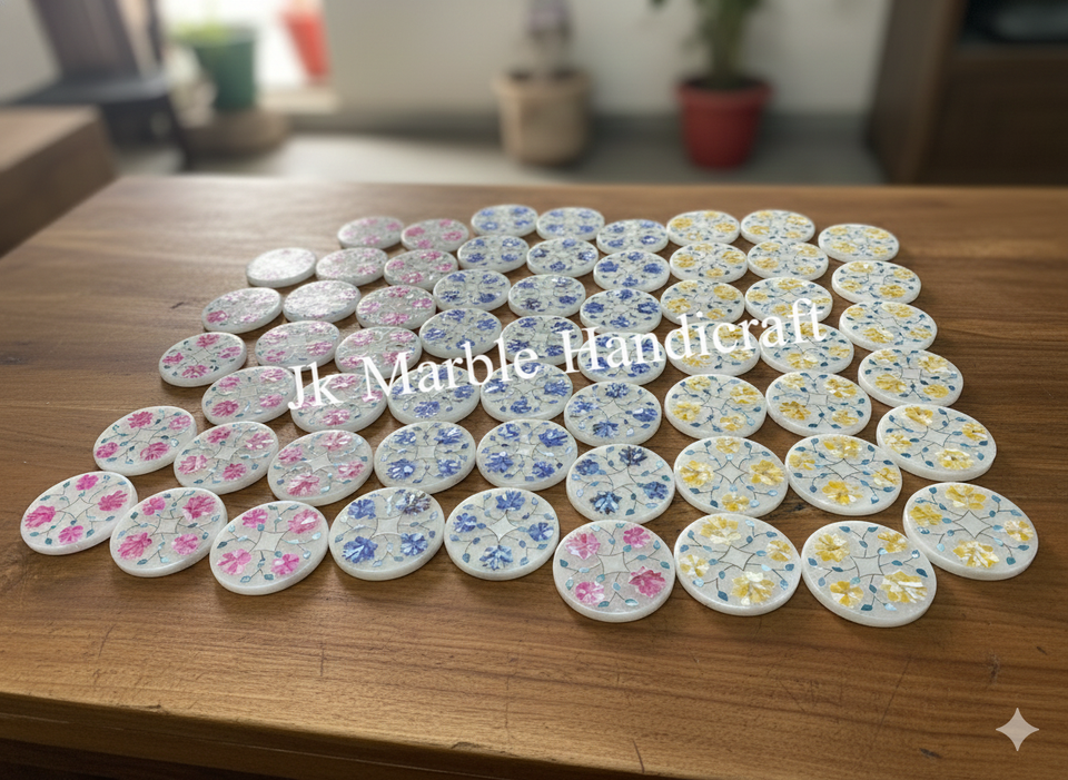 ชุดจานรองแก้วชาทำมือ ขัดเงา ลายดอกไม้สีเหลืองธรรมชาติ สไตล์ศาสนา งานฝีมือหินอ่อนฝังลายคุณภาพสูง สวยงาม