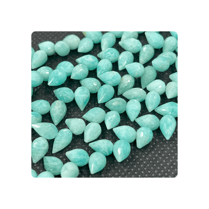 ลูกปัดพลอยธรรมชาติระดับพรีเมี่ยมทำด้วยมือสีเขียวอเมซอนไนต์ทรงลูกแพร์ขนาด7x9มม. และขนาด9x12มม. สำหรับการทำเครื่องประดับแบบหนา