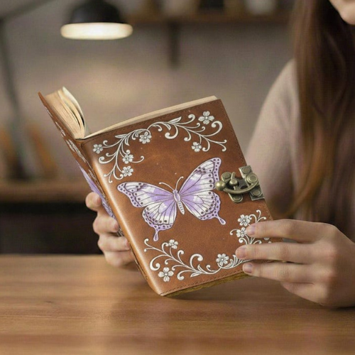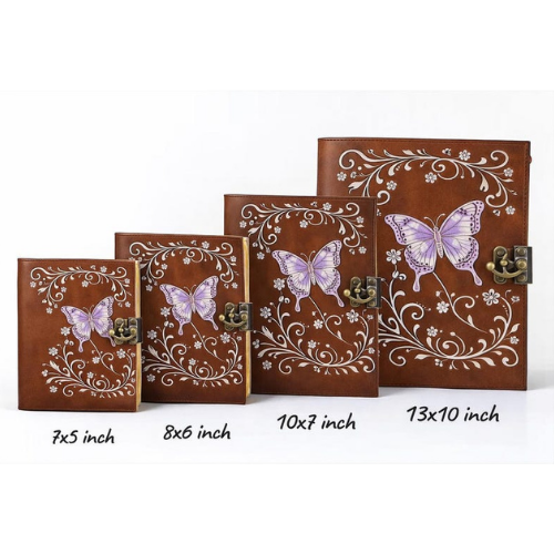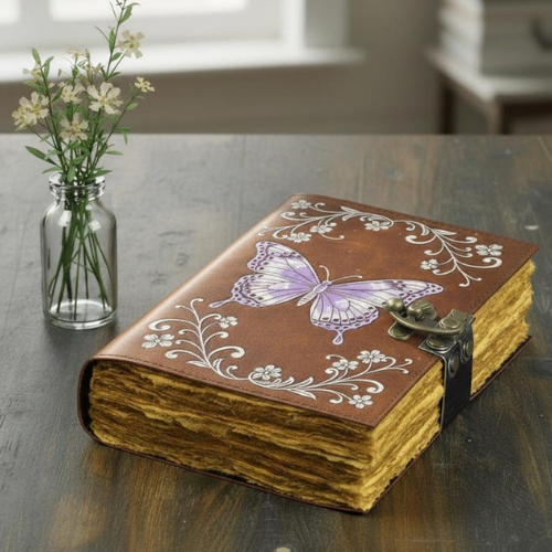 สมุดบันทึกหนังลายผีเสื้อจันทราพิมพ์ลายทำมือ สีน้ำตาลวินเทจ ลายดอกไม้ พร้อมตัวล็อคทองเหลือง ปกแข็ง คลาสสิก ขนาด 7x5 นิ้ว