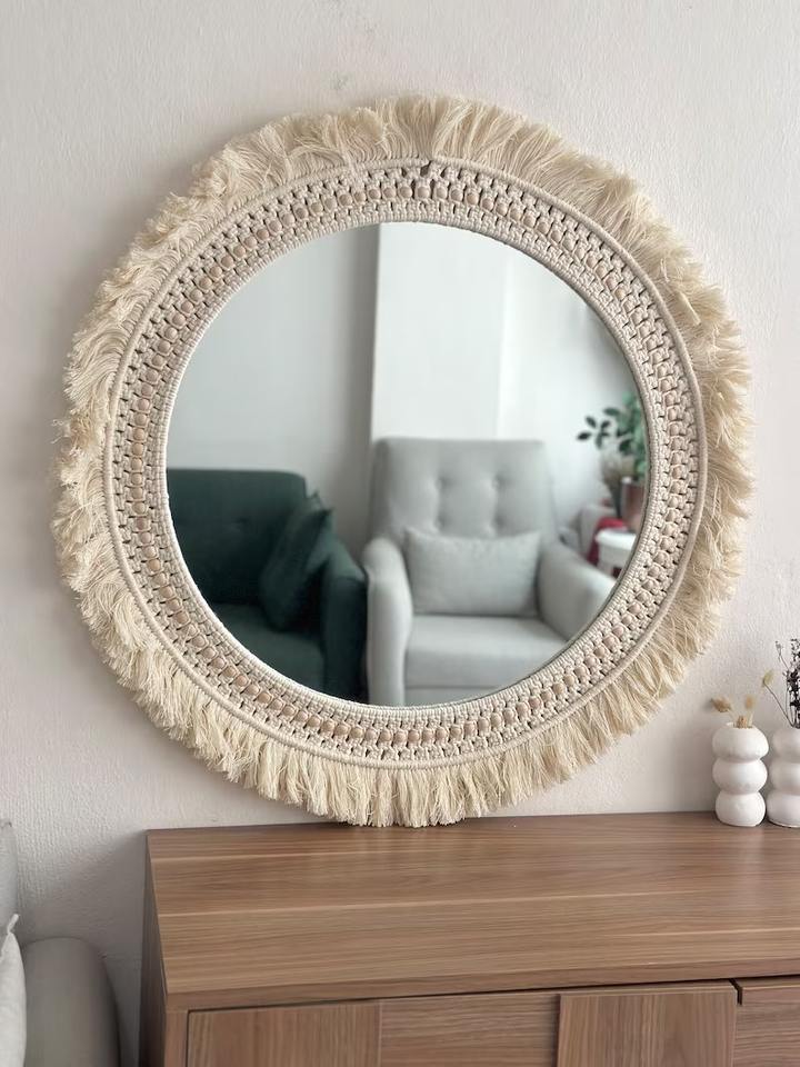 กระจกแขวนผนังทำด้วยมือแบบทันสมัยมาคราเม่ดีไซน์หรูหราสำหรับตกแต่งบ้าน