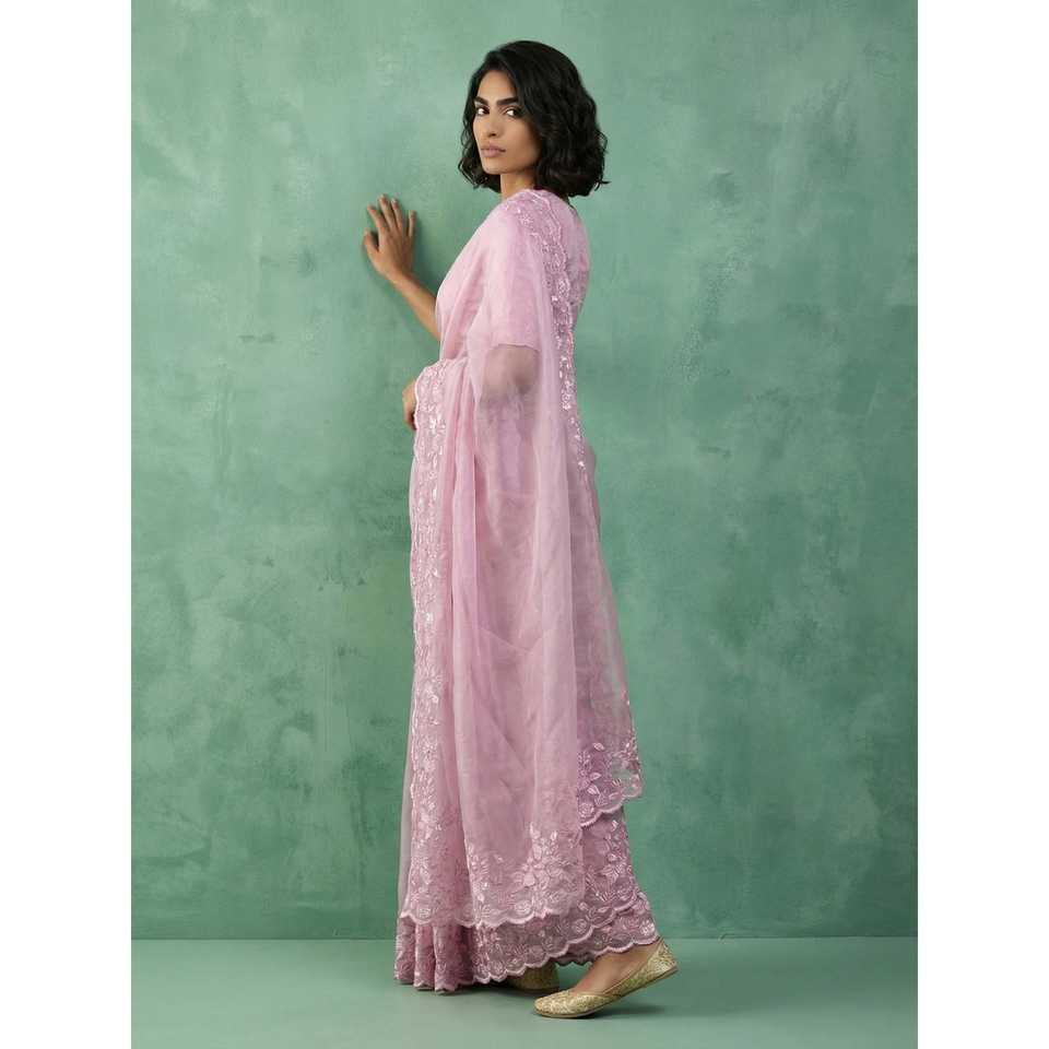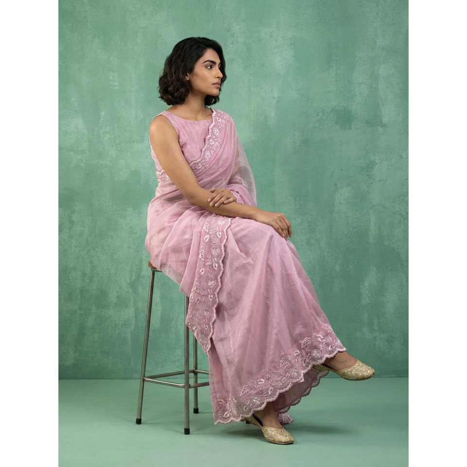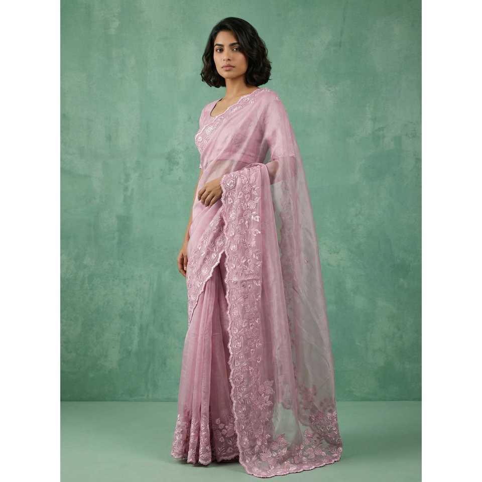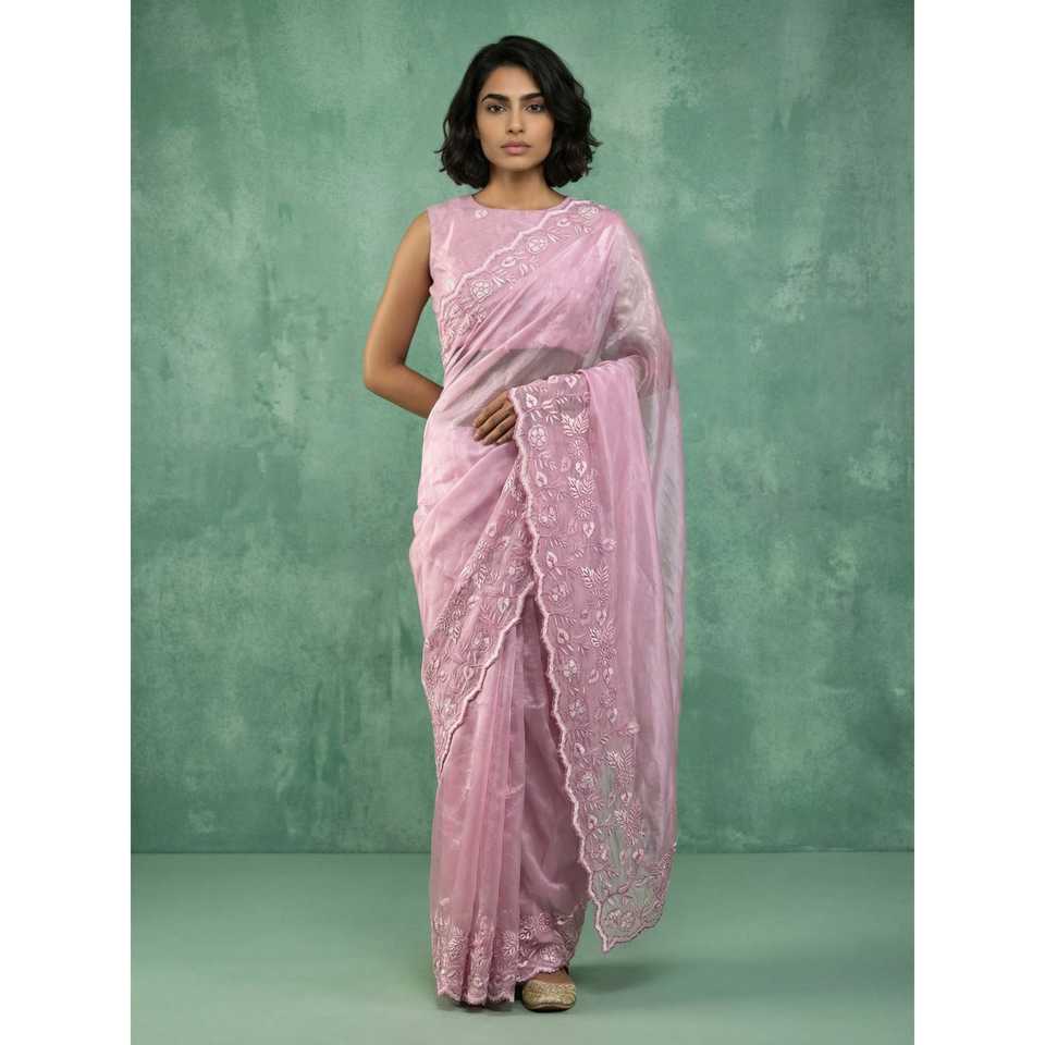 ผ้าไหมชานด้าแท้ทำมือ ปักลายดอกไม้ งานปักชิฟฟ์ลี เรแชม ซารี งานฉลุลายขอบผ้าพิมพ์ลายชีฟฟ่อน ผ้าทรงตรง
