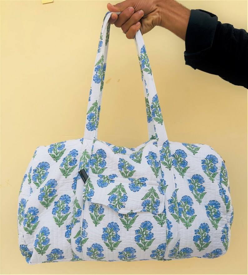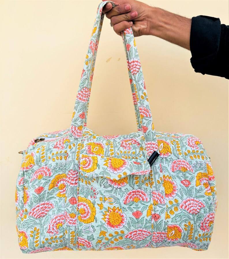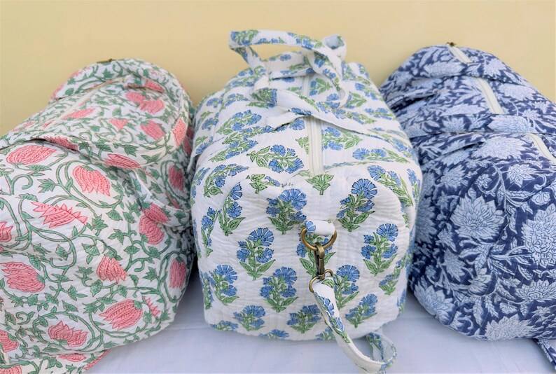 กระเป๋าเดินทางสุดสัปดาห์ผ้าฝ้ายเย็บมือลายดอกไม้: กระเป๋าเดินทางแบบดัฟเฟิลพิมพ์ลายบล็อกดอกไม้ กระเป๋าเดินทางสุดสัปดาห์ทำมือ กระเป๋าเดินทางค้างคืนสำหรับเพื่อนเจ้าบ่าว