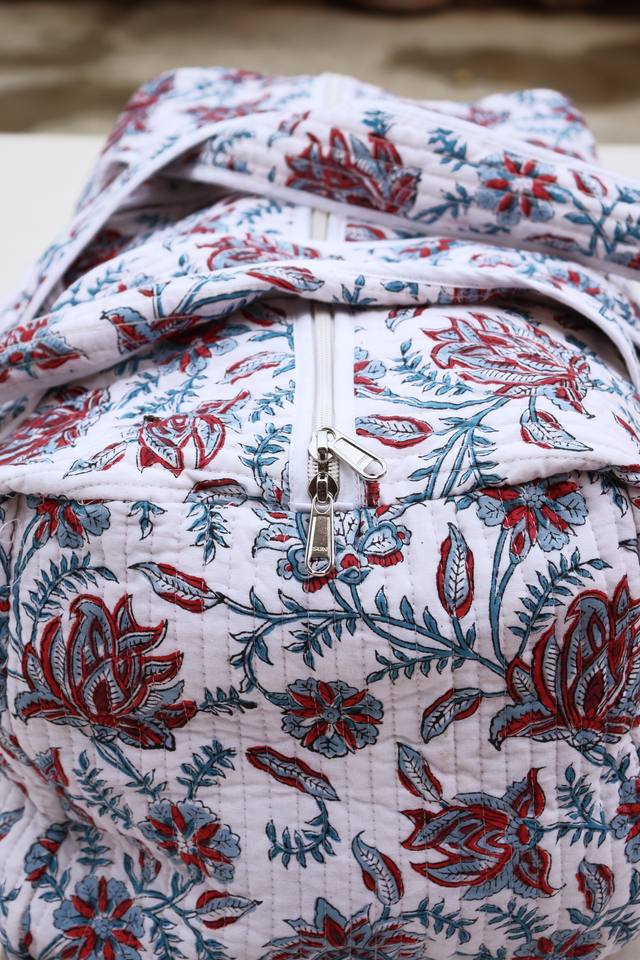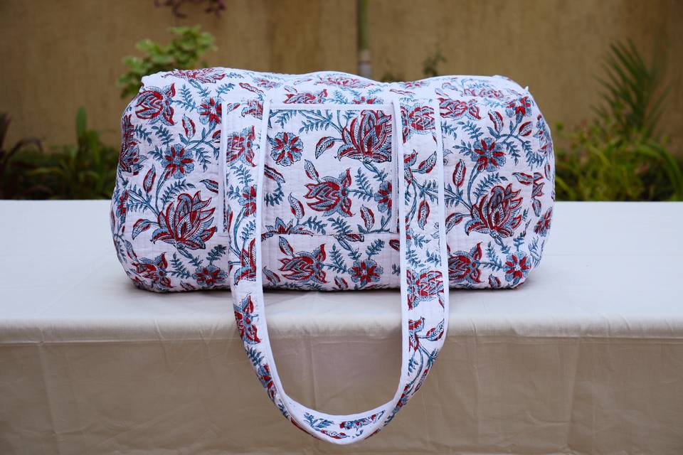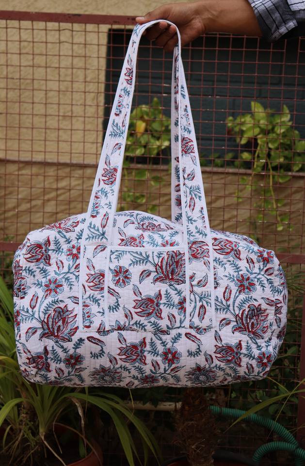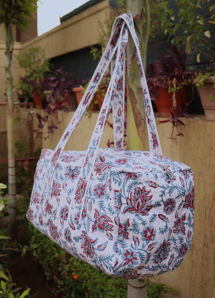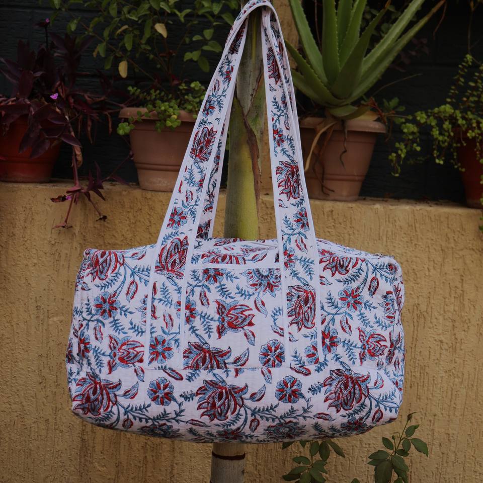กระเป๋าเดินทางสุดสัปดาห์ผ้าฝ้ายเย็บมือลายดอกไม้: กระเป๋าเดินทางแบบดัฟเฟิลพิมพ์ลายบล็อกดอกไม้ กระเป๋าเดินทางสุดสัปดาห์ทำมือ กระเป๋าค้างคืนสำหรับเพื่อนเจ้าบ่าว
