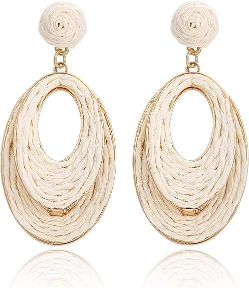 ต่างหูห่วงปาล์มทำด้วยมือสำหรับผู้หญิงเครื่องประดับแบบห้อยสไตล์โบฮีเมียนน้ำหนักเบาวันหยุดพักผ่อนชายหาดในฤดูร้อนดีไซน์แบบฟางทรงรีทรงกลม