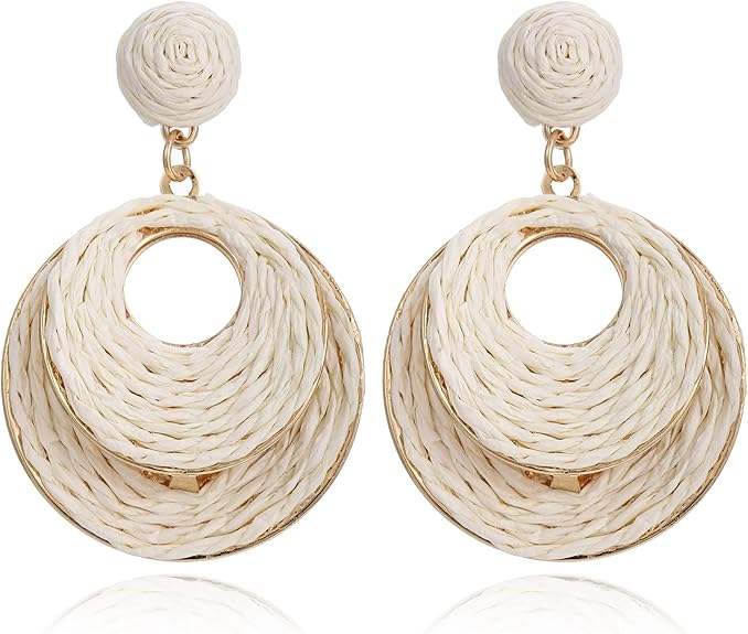 ต่างหูห่วงปาล์มทำด้วยมือสำหรับผู้หญิงเครื่องประดับแบบห้อยสไตล์โบฮีเมียนน้ำหนักเบาวันหยุดพักผ่อนชายหาดในฤดูร้อนดีไซน์แบบฟางทรงรีทรงกลม