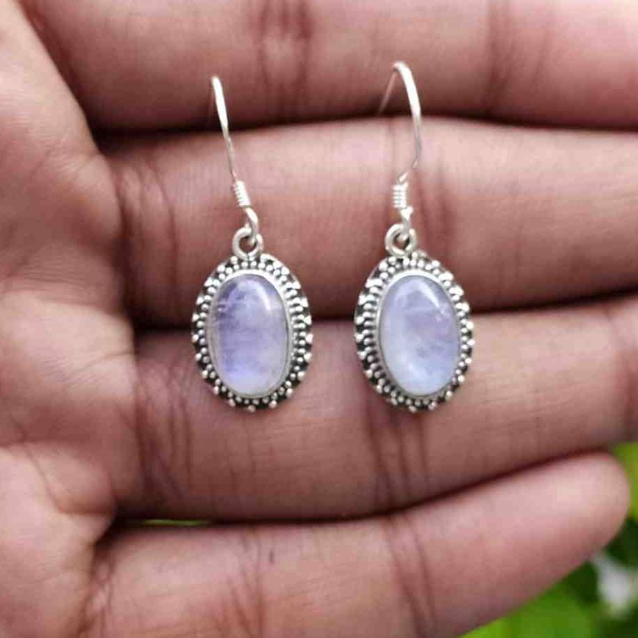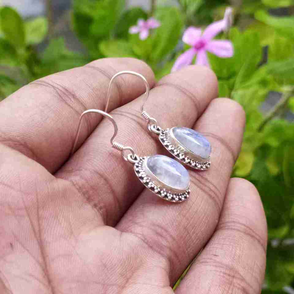 925พลอยมูนสโตนสีรุ้งทำด้วยมือต่างหูเงินสเตอร์ลิงต่างหูงานฝีมือแนวโบฮีเมียนดีไซน์ทันสมัย