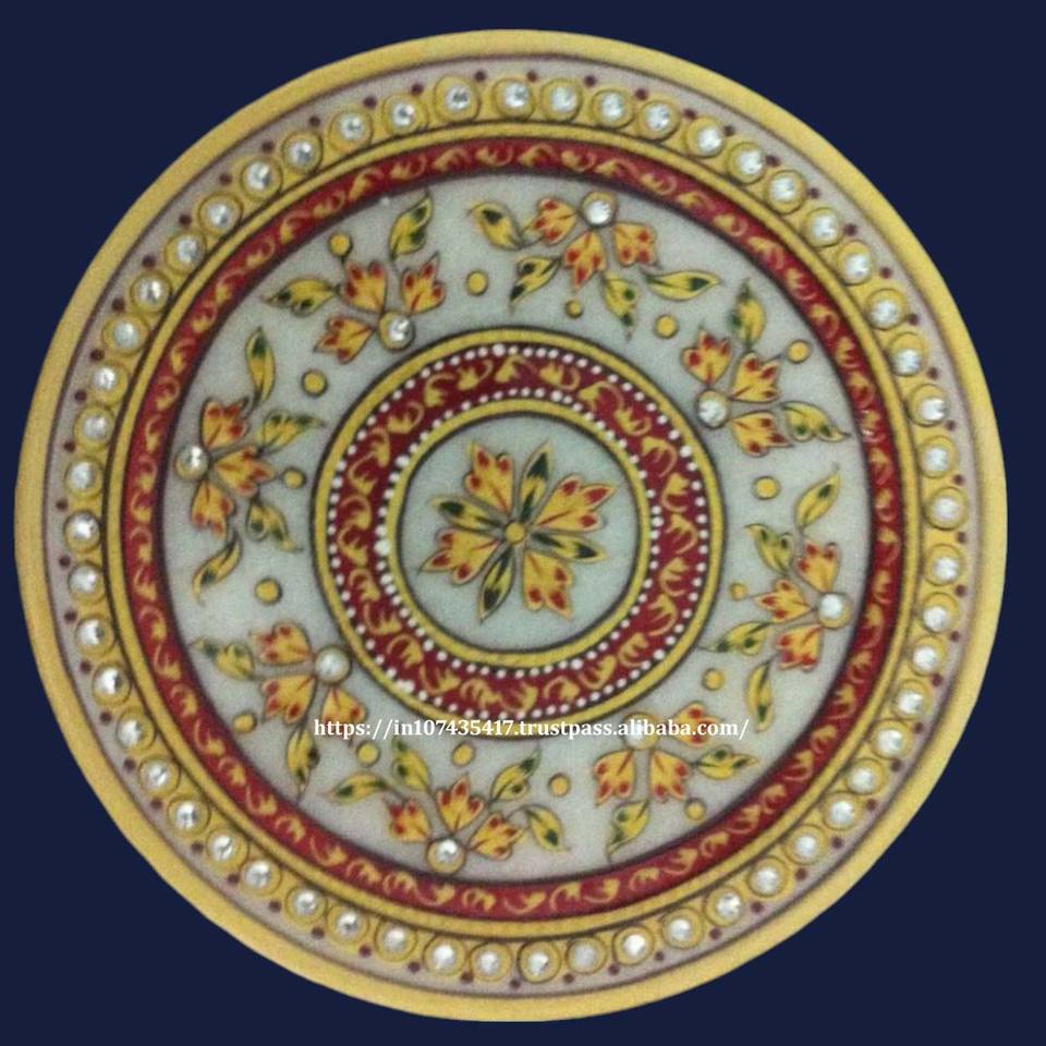Handmade Rajasthani Gold Painted White Marble Makrana Stone Plate Indian Traditional Pooja Thali Plate for Business or Gift Use