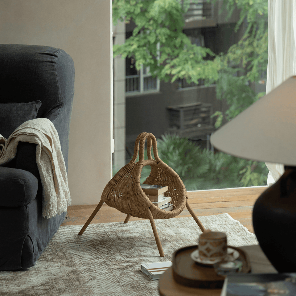 ชั้นวางนิตยสารทำด้วยมือหวายสไตล์โบโฮที่ใส่หนังสือพิมพ์ตะกร้าใส่ของจากอ้อยธรรมชาติที่จัดระเบียบห้องนั่งเล่นแบบทันสมัยเฟอร์นิเจอร์