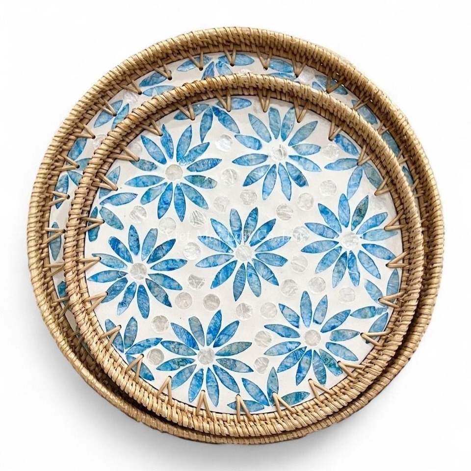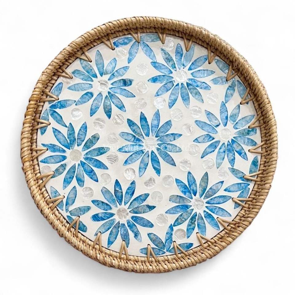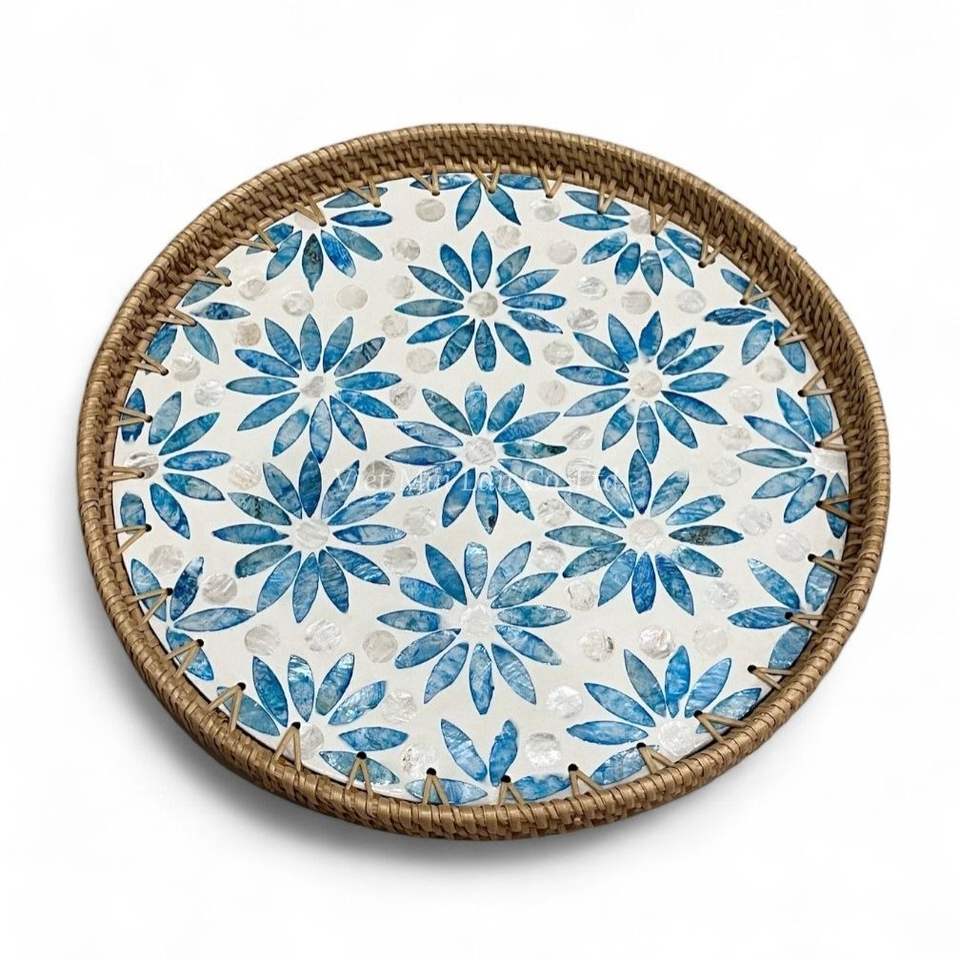 ถาดหวายทำมือ ประดับมุก ถาดตกแต่ง งานฝีมือจากเปลือกหอย เป็นมิตรกับสิ่งแวดล้อม สำหรับใช้ในบ้าน ห้องครัว โต๊ะอาหาร