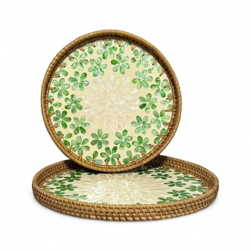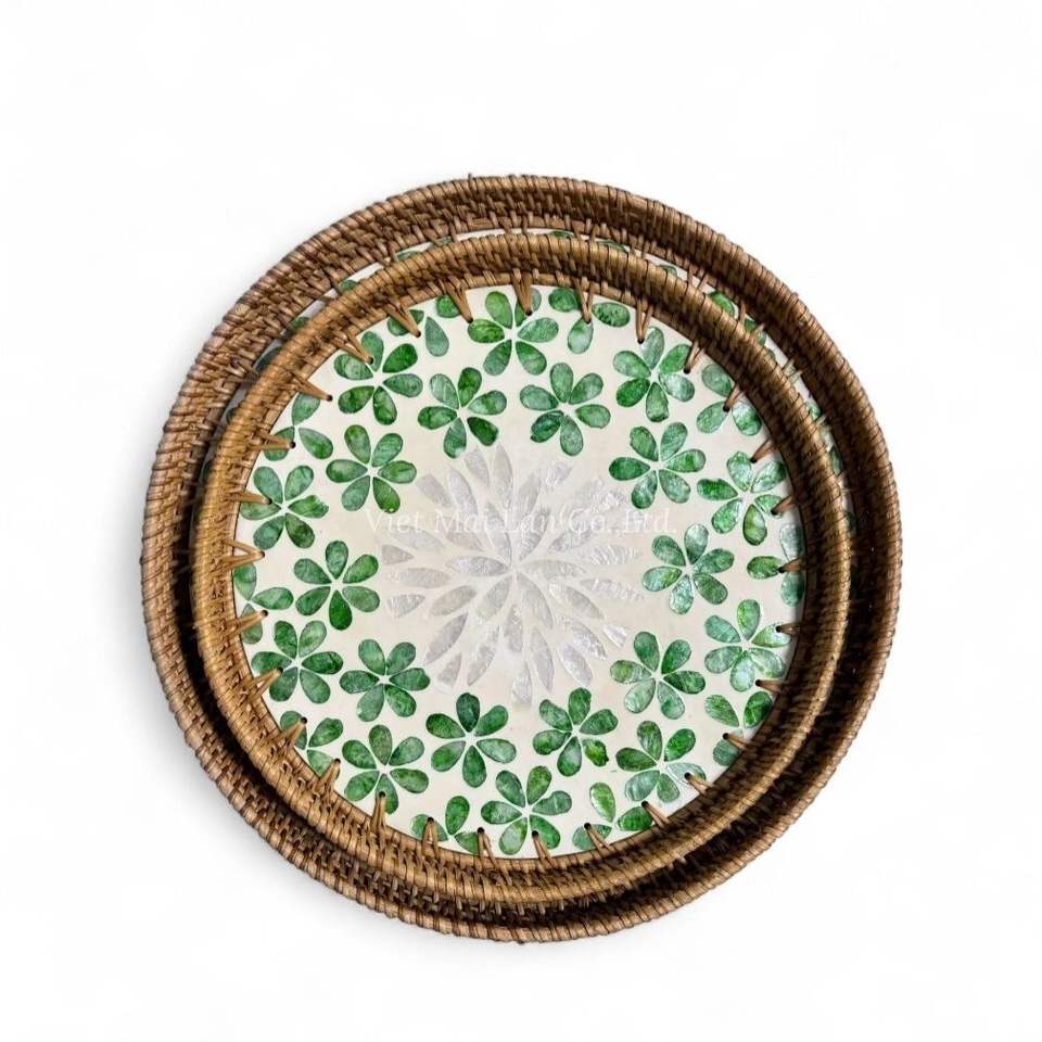 ถาดหวายทำมือประดับมุก ถาดตกแต่งฝังเปลือกหอยธรรมชาติ เป็นมิตรกับสิ่งแวดล้อม ใช้บนโต๊ะในบ้าน