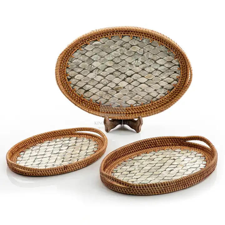 ถาดรองแก้วแบบสานทำด้วยมือถาดสำหรับใส่ผลไม้และกาแฟถาดเสิร์ฟพร้อมฐานฝังมุก