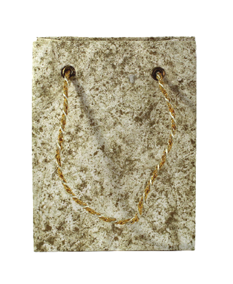 ถุงกระดาษอาร์ตทำมือจากผ้าฝ้ายรีไซเคิล พิมพ์ลายบาติกสีทอง พร้อมเชือกสีทองเมทัลลิก และกล่องใส่