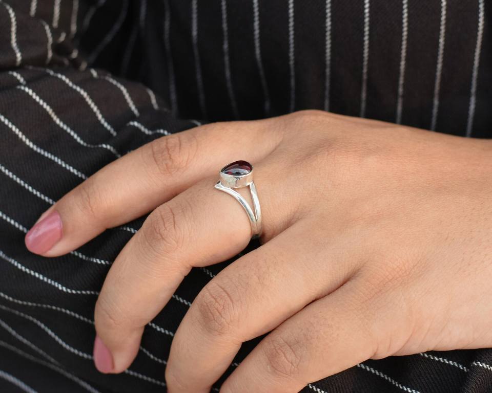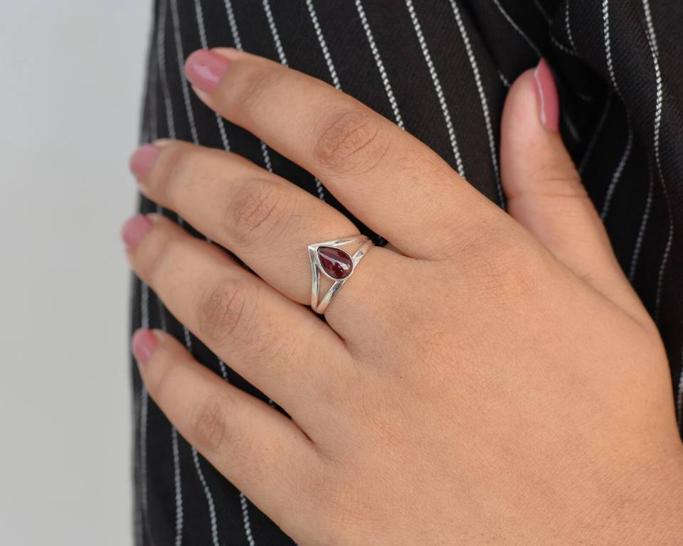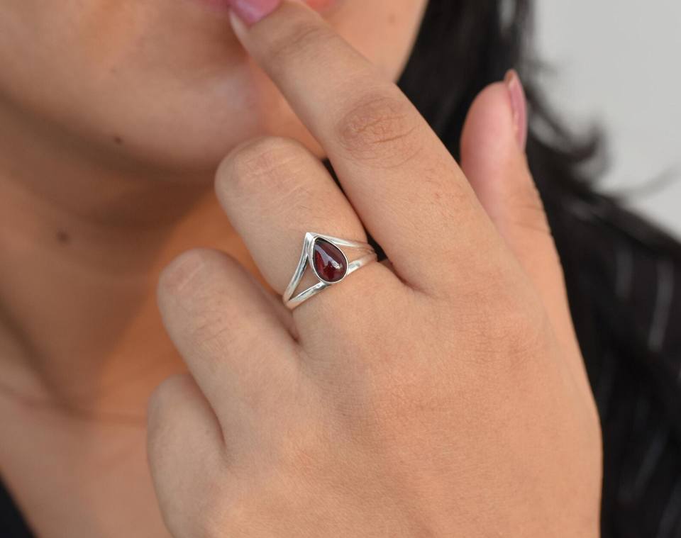 แหวนโกเมนลูกแพร์ทำด้วยมือสีแดงขนาด6x9มม. 925เครื่องประดับเงินสเตอร์ลิงแหวนอัญมณีธรรมชาติของขวัญสำหรับผู้หญิง