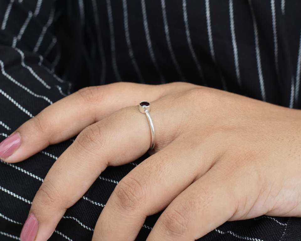แหวนโกเมนทรงกลมทำด้วยมือสีแดงทำด้วยมือแหวนเงินสเตอลิง925 4มม. ของขวัญอัญมณีธรรมชาติที่ไม่ซ้ำใครสำหรับผู้หญิง