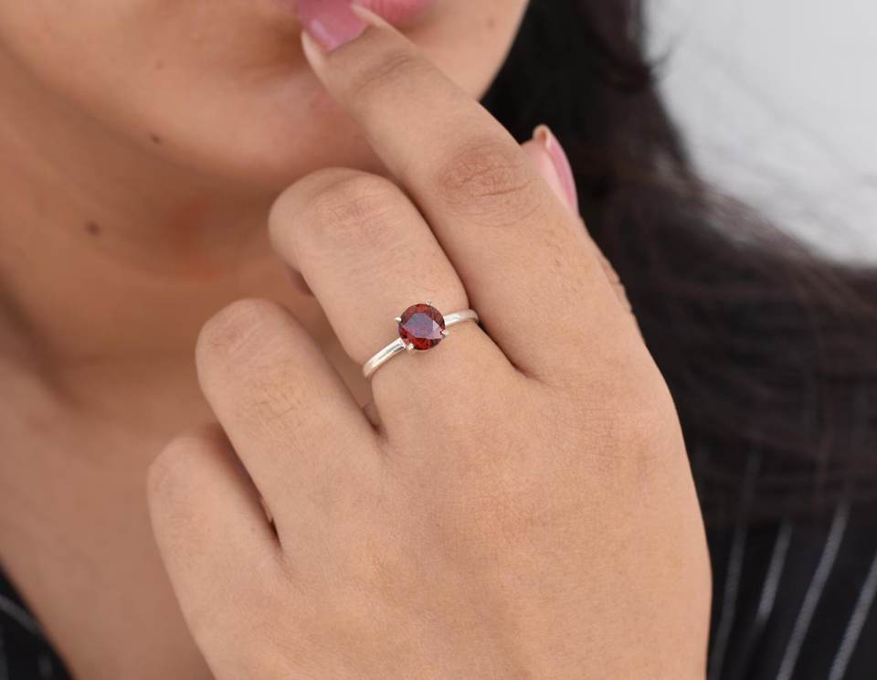แหวนโกเมนทรงกลมทำด้วยมือสีแดงขนาด7มม. 925เครื่องประดับเงินสเตอร์ลิงของขวัญอัญมณีธรรมชาติสำหรับผู้หญิง