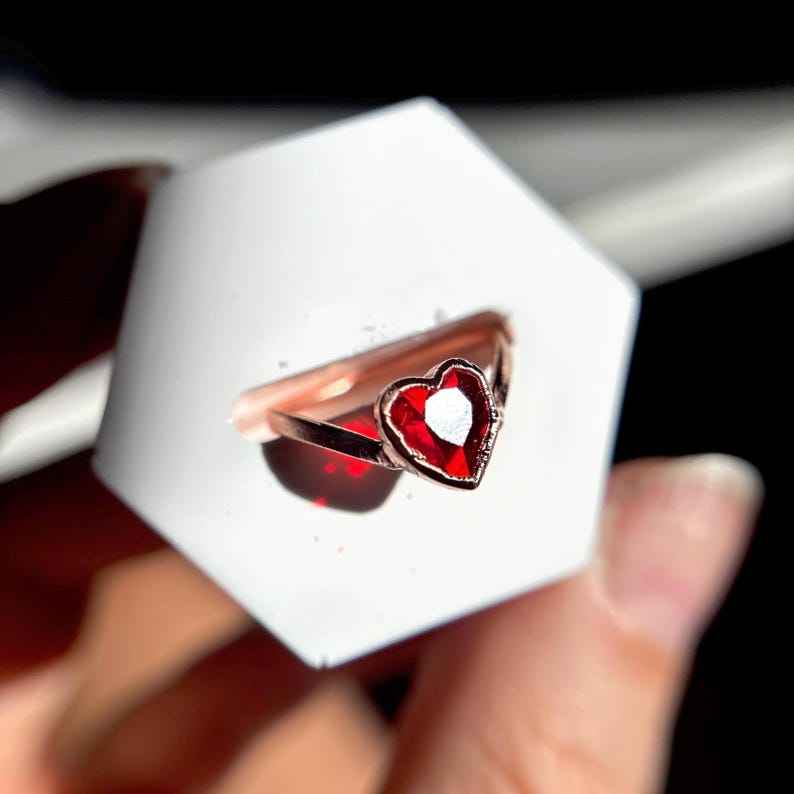 แหวนหัวใจควอทซ์สีแดงทำด้วยมือเครื่องประดับอัญมณีคริสตัลรูปตัววีแบบเฉพาะตัวแหวนปรับขนาดได้