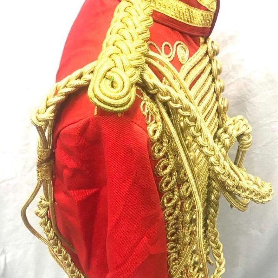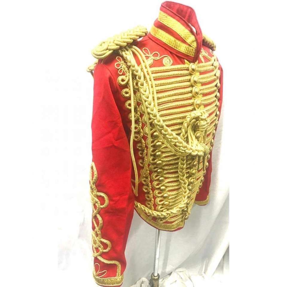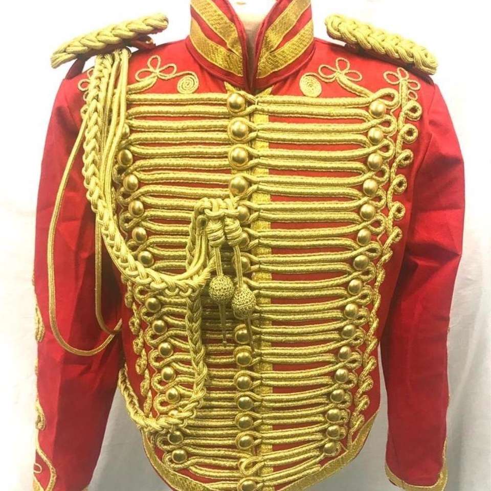 แจ็คเก็ตฮัสซาร์ผ้าขนสัตว์สีแดงทำมือ เสื้อโค้ทสไตล์สตีมพังก์ พร้อมชุดสูทสีเขียวมะกอก สีแดง สายรัดทองคำ ชุดเครื่องแบบพิธีการ ผลิตจากผ้าฝ้าย