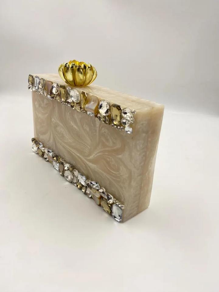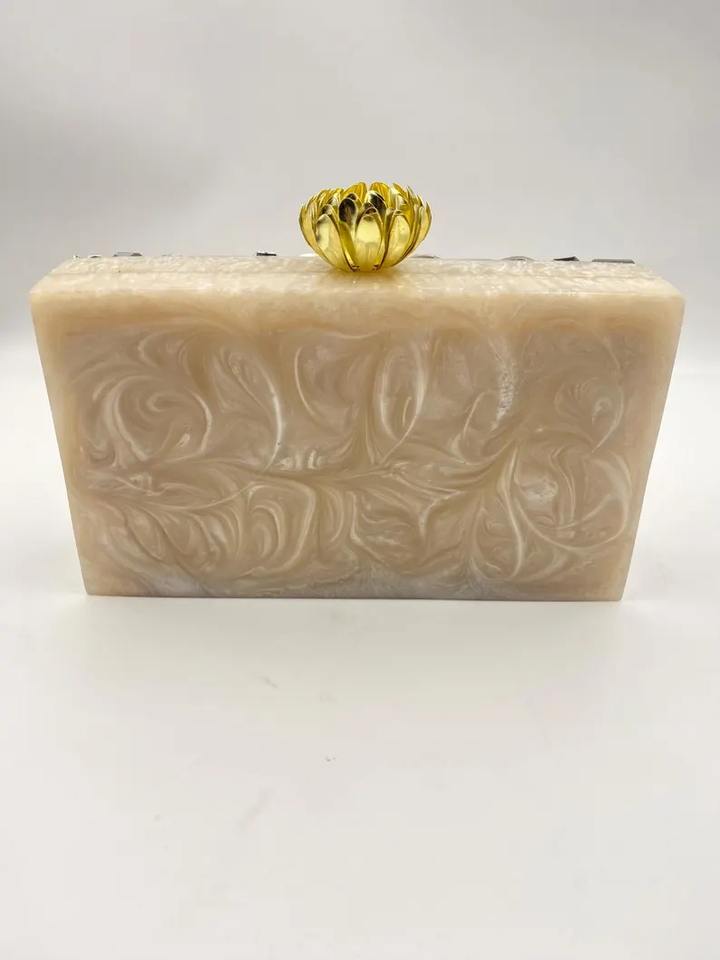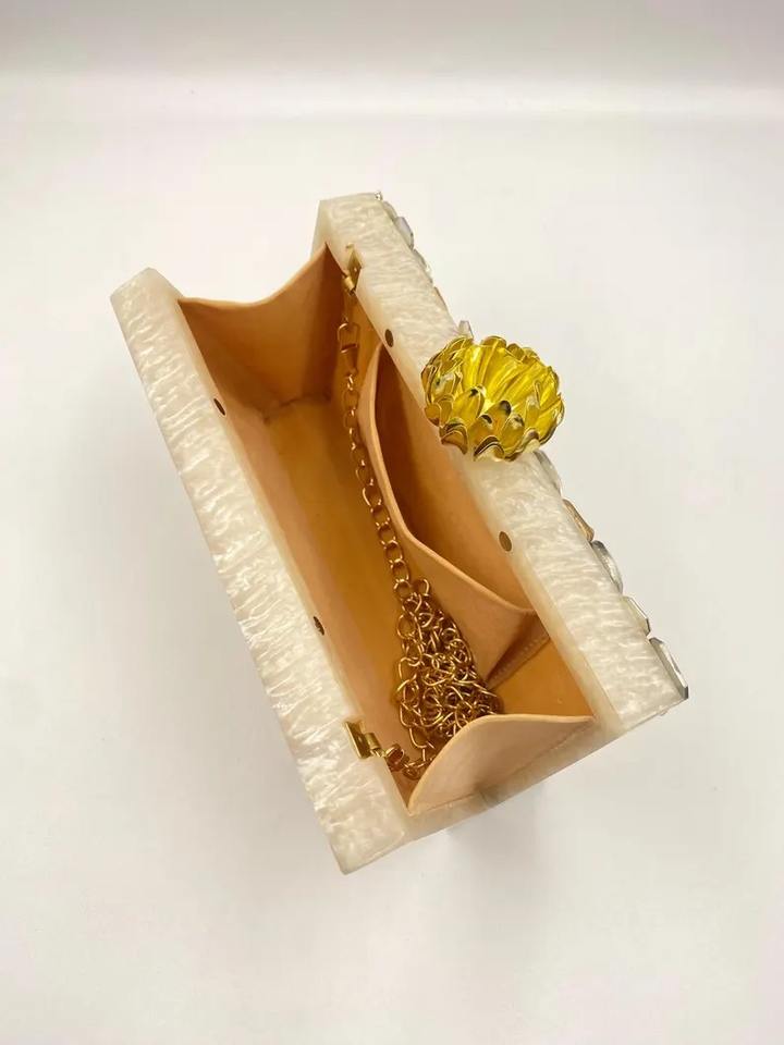 กระเป๋าคลัทช์เรซิ่นทำมือสำหรับผู้หญิง กระเป๋าถือสำหรับสุภาพสตรี กระเป๋าออกงานราคาย่อมเยา ลายดอกไม้สีทองเหลือง