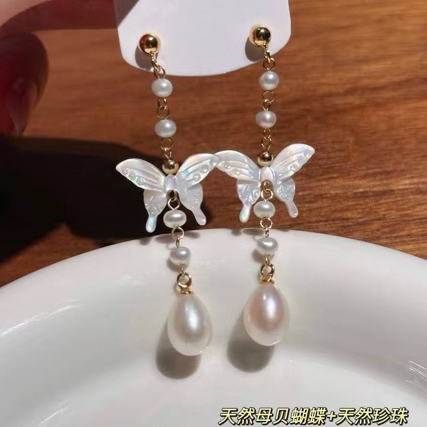 ต่างหูห้อยสไตล์จีนย้อนยุคทำมือ ประดับเปลือกหอย ผีเสื้อ และมุกธรรมชาติ ดีไซน์หรูหราแบบเฉพาะตัว