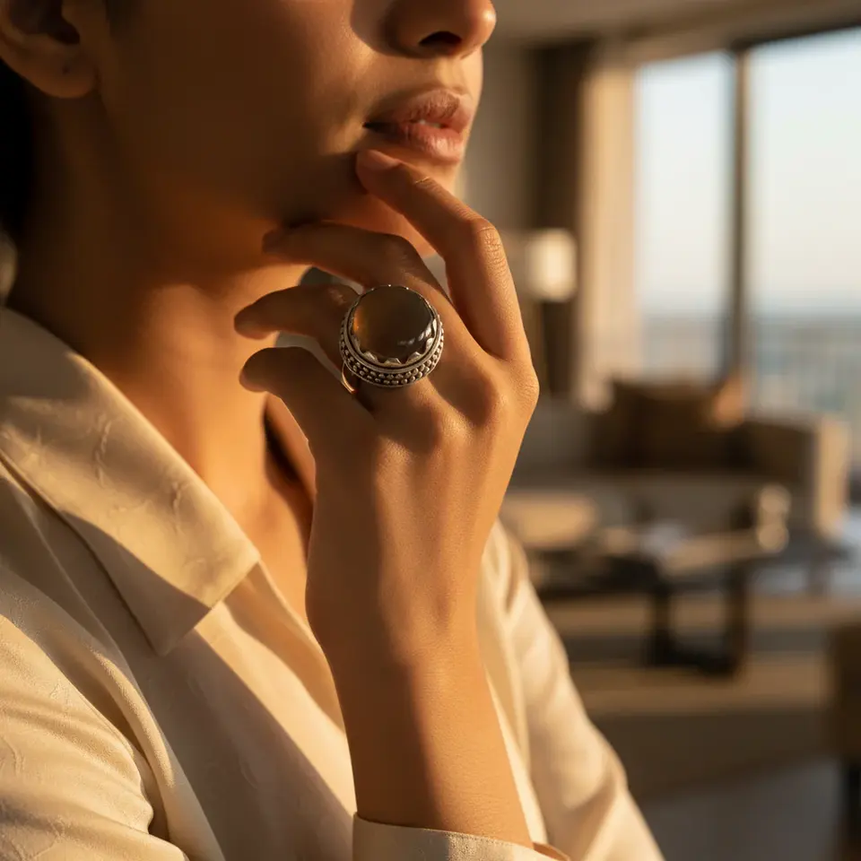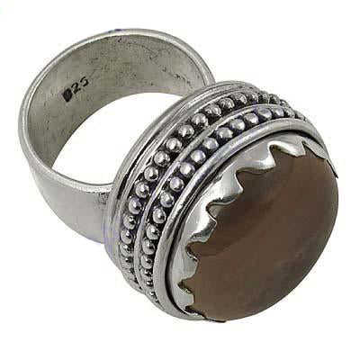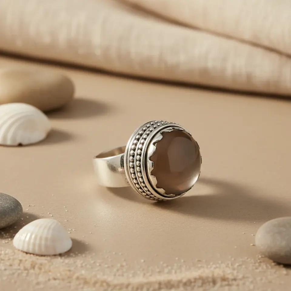 แหวนโบโฮประดับด้วยควอตซ์สโมคกี้และโทแพซชุบโรเดียมทำมือสำหรับผู้หญิง-ได้รับการรับรองจาก GRS