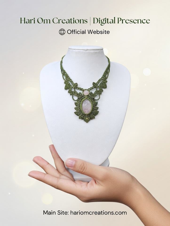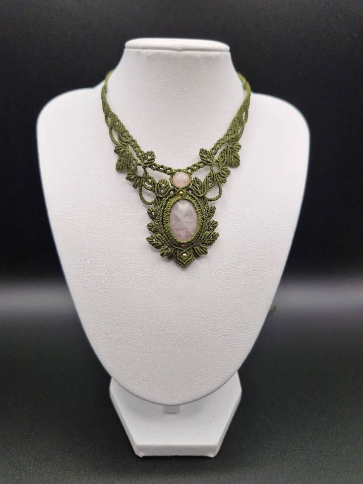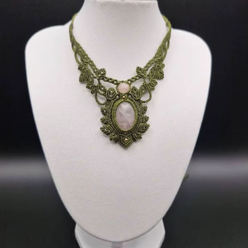 สร้อยคอทำมือจากโรสควอตซ์แบบมาคราเม่ สไตล์โบโฮ เชือกสีเขียวมะกอก ประดับด้วยพลอยสีชมพู เครื่องประดับเพื่อสุขภาพ ขายส่ง
