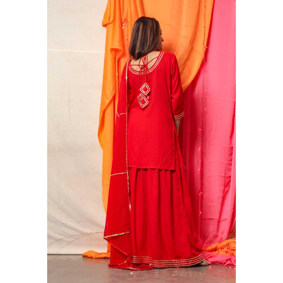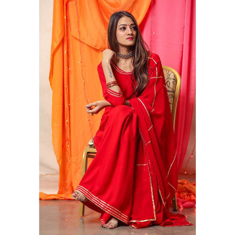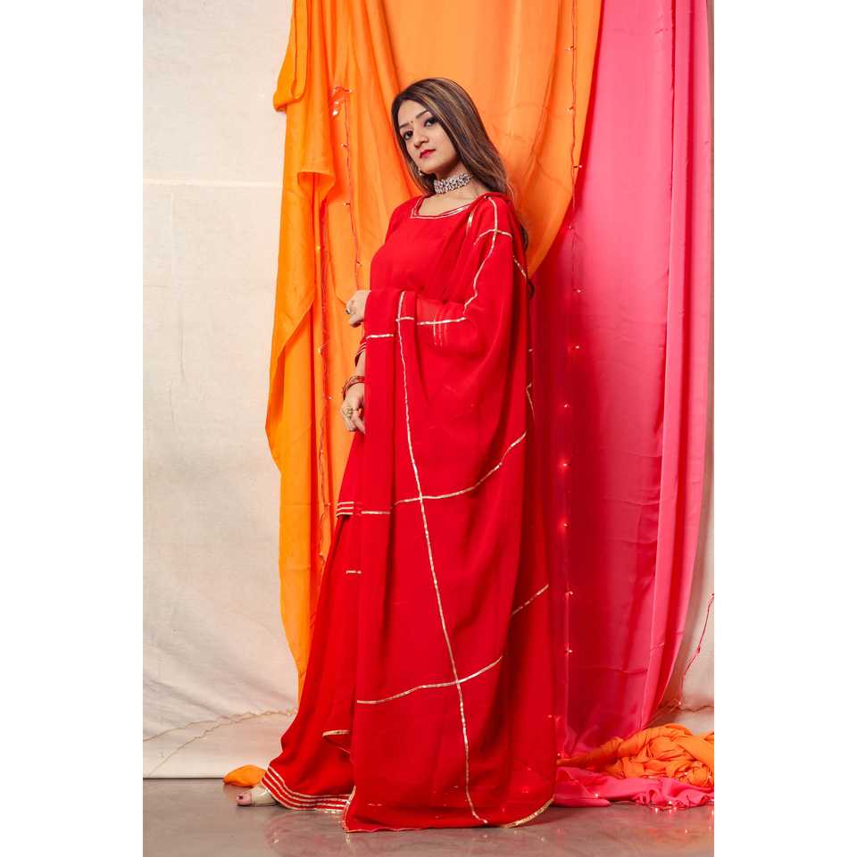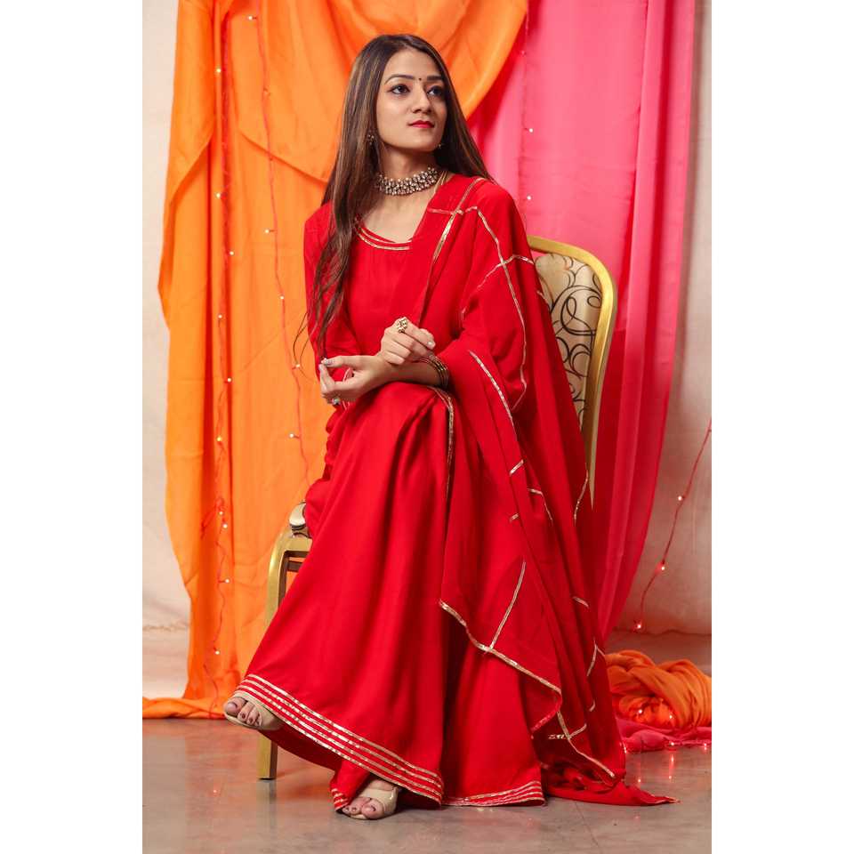ชุดเดรสทรงเอไลน์สีแดงกุหลาบประดับด้วยลายปักสีทองแบบแฮนด์เมด ไซส์ XS เอวทรงเอ็มไพร์ คอไขว้แบบผูกเชือก ผ้าออร์แกนซ่า