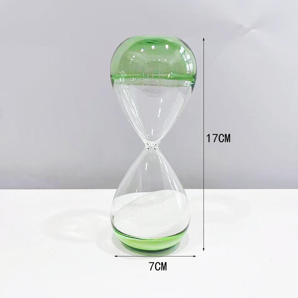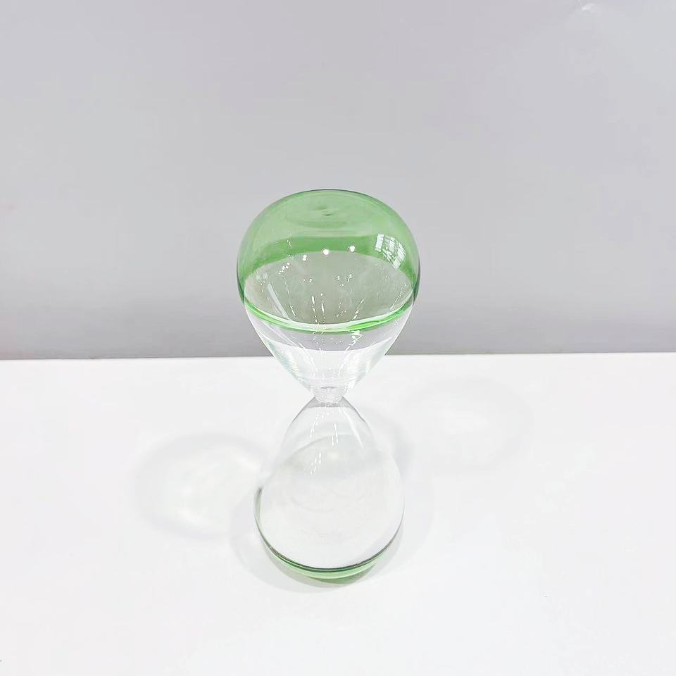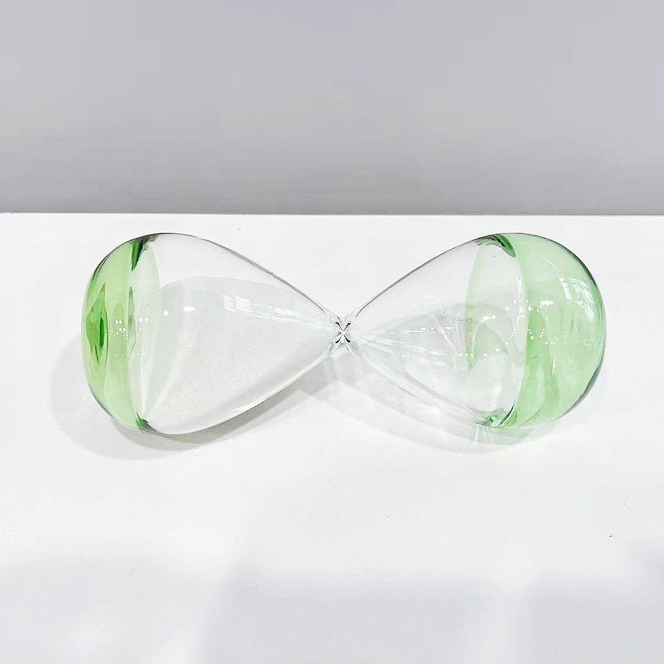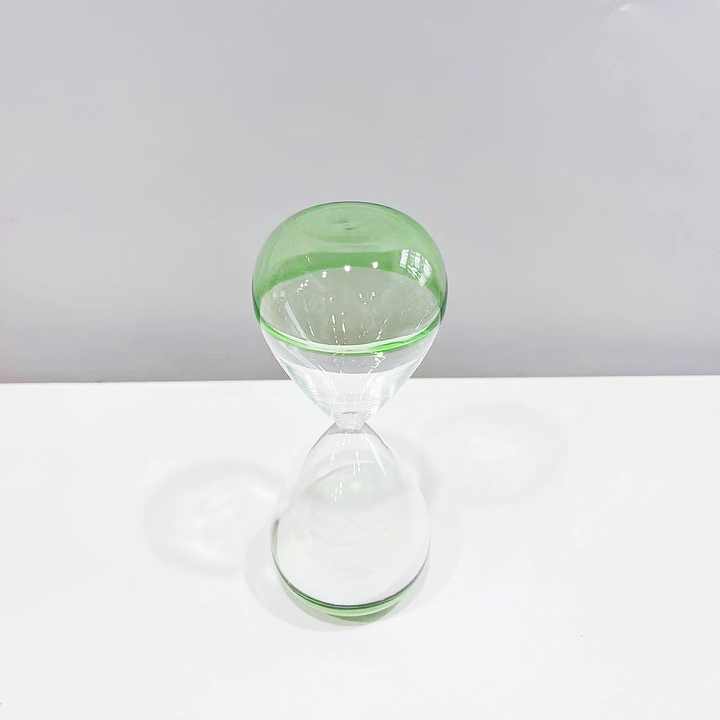 นาฬิกาทรายแก้วใสแบบหมุนได้ทำด้วยมือพร้อมรายละเอียดสีเขียวนาฬิกาทรายจับเวลาสำหรับงานแต่งงานของขวัญการจัดการเวลาที่ทันสมัย