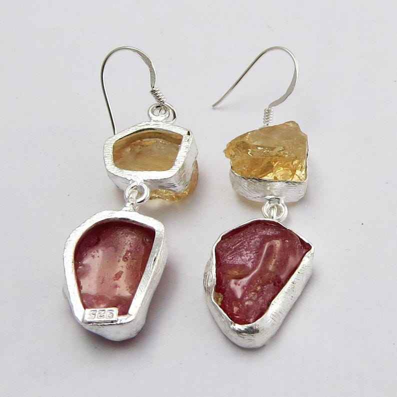 ต่างหูพลอยซิทรินรูบี้ดิบทำมือ เงินแท้ 925 เครื่องประดับพลอยธรรมชาติ