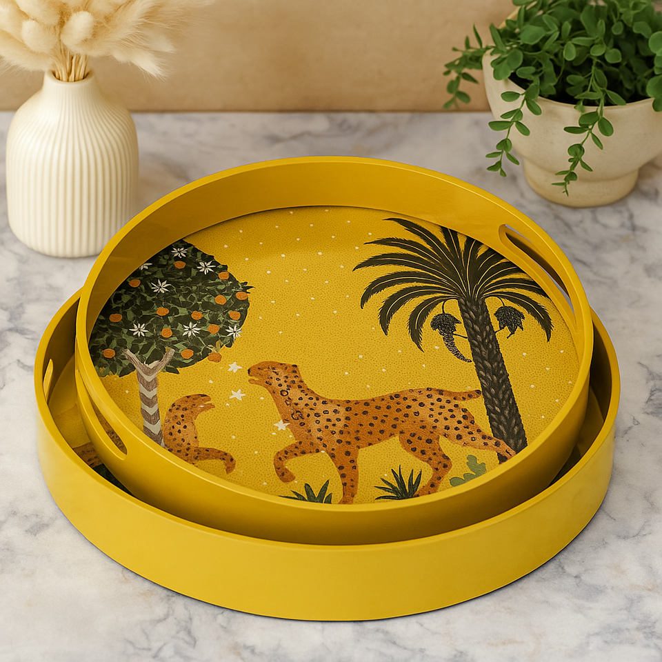 ถาดเสิร์ฟแลคเกอร์ MDF ทรงกลมทำด้วยมือพร้อมลายเสือชีตาห์และต้นปาล์มสีเหลืองตกแต่งมันวาว