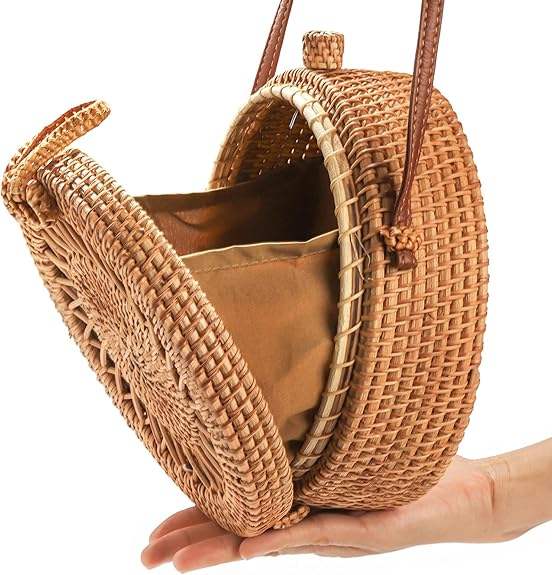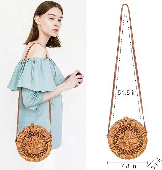 กระเป๋าหวายทรงกลมทำมือพร้อมสายหนัง | กระเป๋าสะพายข้างสานสำหรับฤดูร้อน กระเป๋าชายหาดสำหรับผู้หญิง กระเป๋าสะพายไหล่แฟชั่น