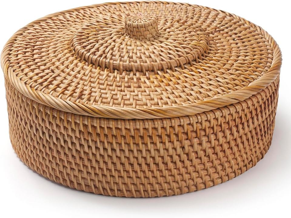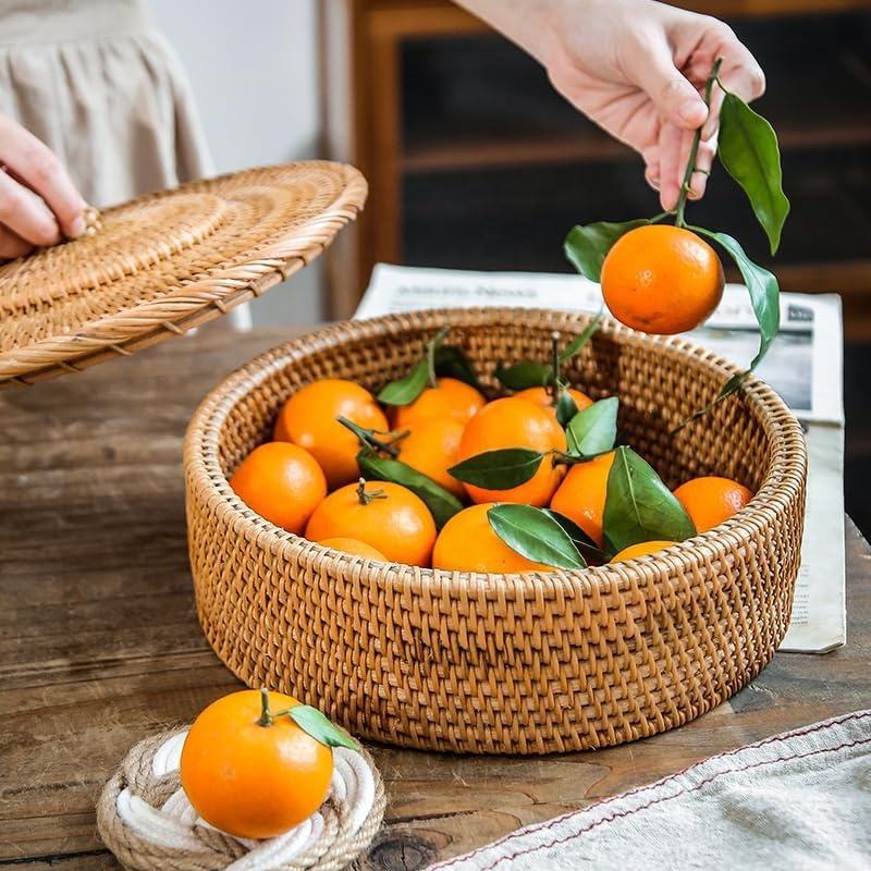ถาดเก็บของทรงกลมหวายสานมือพร้อมฝาปิด | ตะกร้าขนมปังและผลไม้แบบสานพร้อมฝาปิด