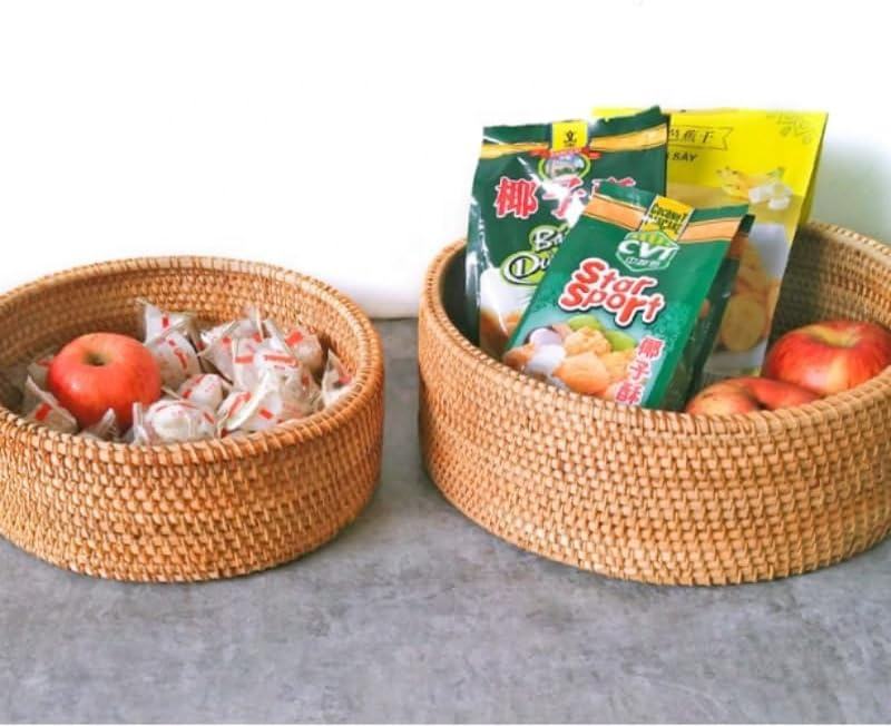 ถาดเก็บของทรงกลมหวายแท้ทำมือพร้อมฝาปิด | ตะกร้าขนมปังและผลไม้แบบทอพร้อมฝาปิด