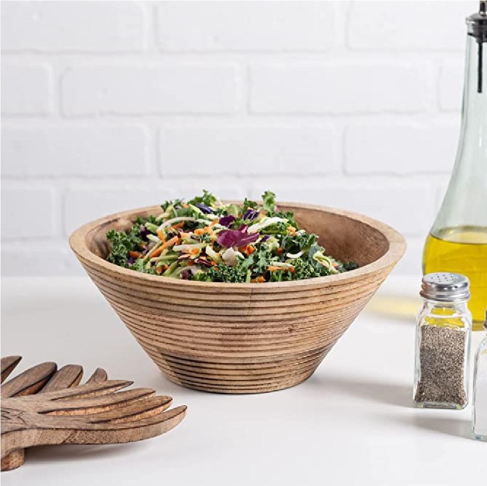 ชามสลัดไม้รูปทรงกลมทำด้วยมือทำจากไม้ธรรมชาติดีไซน์เรียบง่ายเหมาะสำหรับการรับประทานอาหารบนโต๊ะและใช้ในครัว