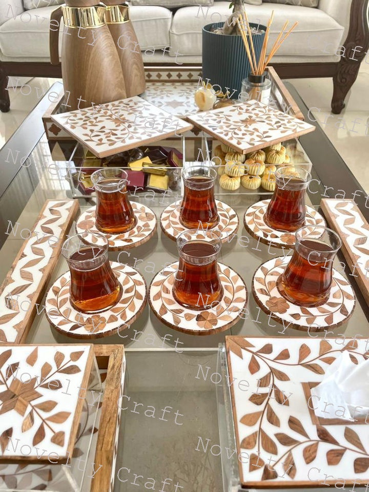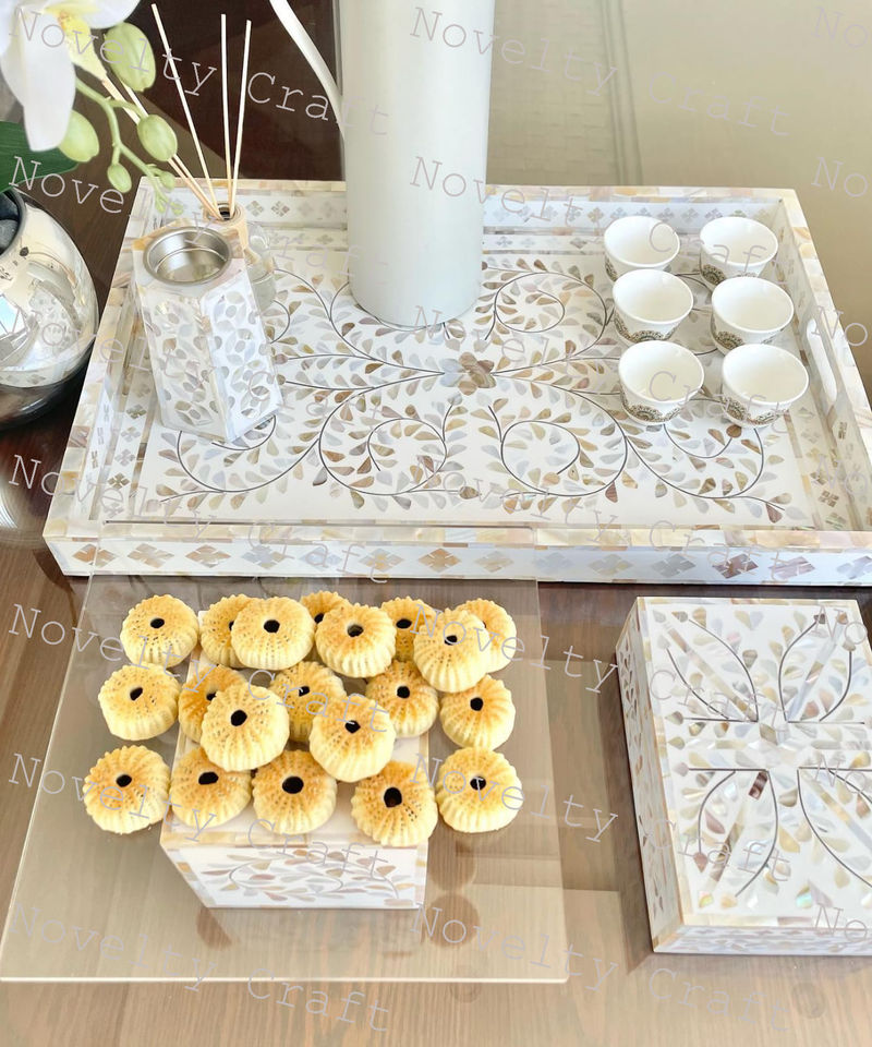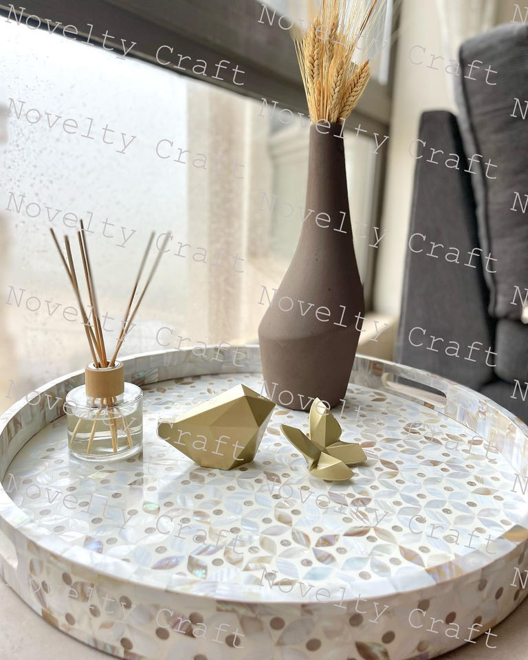 ถาดไม้กลมทำด้วยมือพร้อมสลักกระดูกสีดำและสีขาวขนาดกำหนดเองถาดเสิร์ฟเรซิ่น MDF พร้อมมุกตกแต่งบ้าน