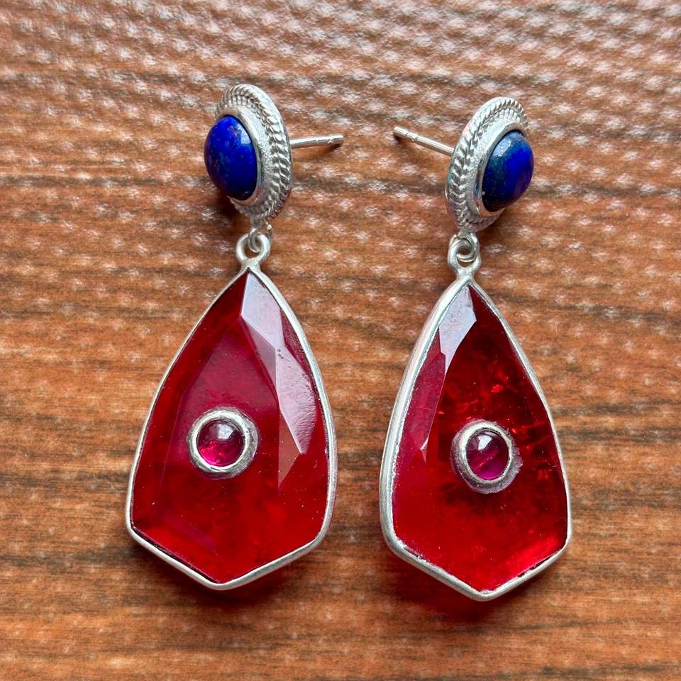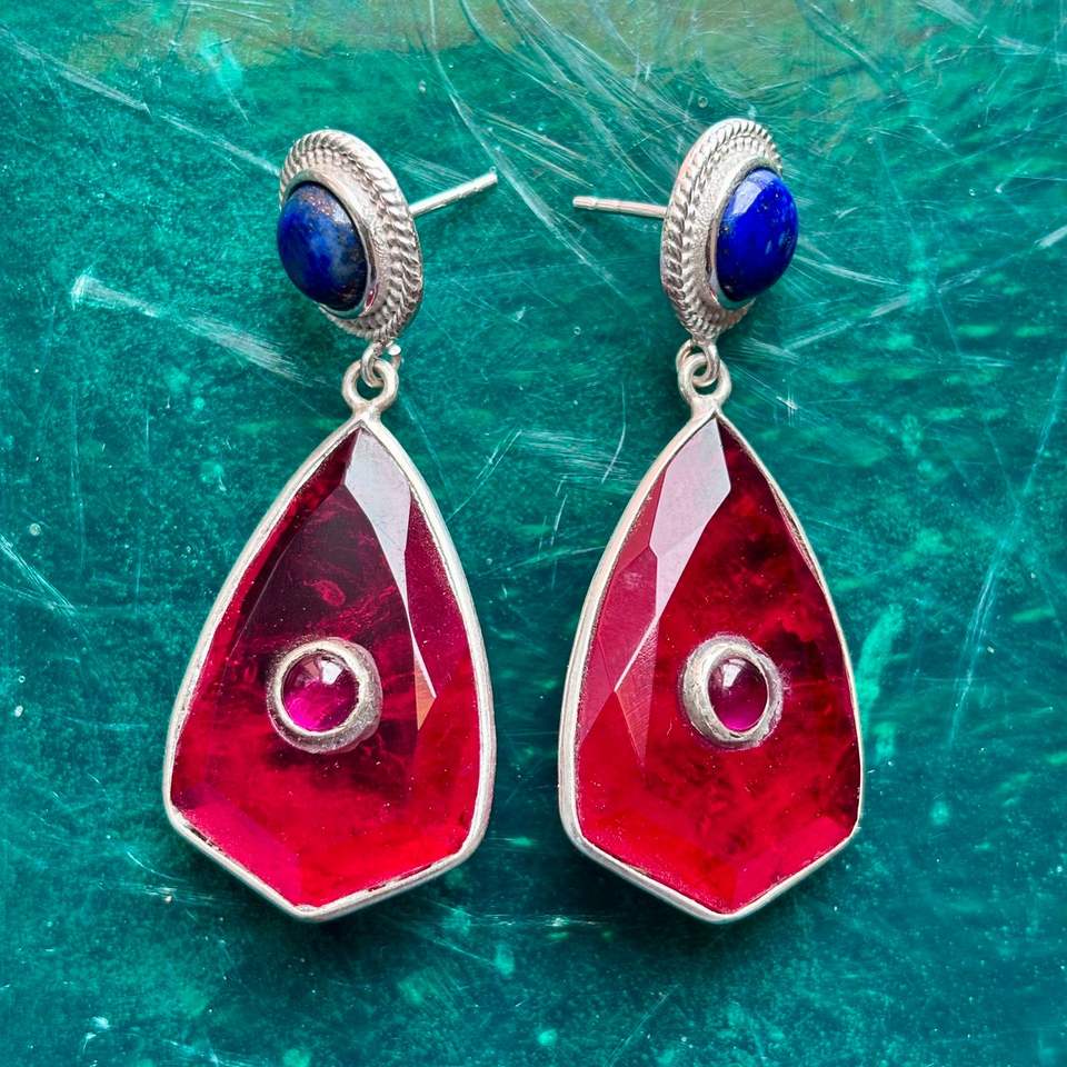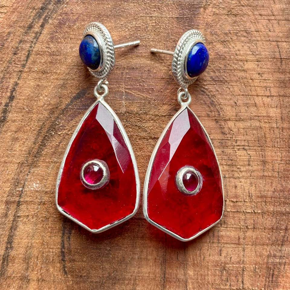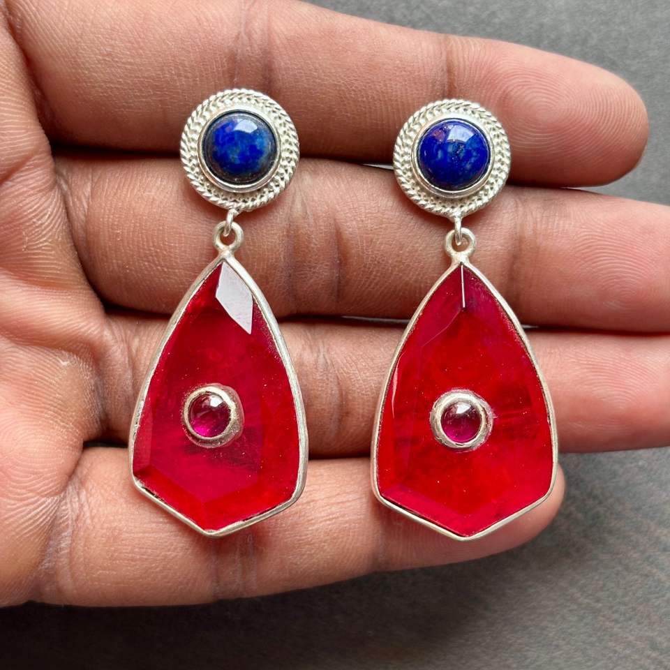 คริสตัลทับทิมทำด้วยมือและ Lapis Lazuli ต่างหูห้อยรูปทรงเรขาคณิตลดลงด้วยการตั้งค่าชุบเงิน