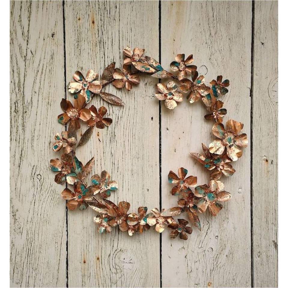 งานศิลปะแขวนผนังรูปพวงหรีดดอกไม้ทำมือจากโลหะทองแดงแบบเรียบง่าย สีเขียวสนิม สำหรับตกแต่งห้องนั่งเล่น สวน และบ้าน
